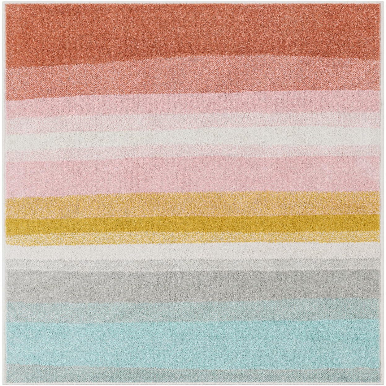 Broad, painterly stripes give this polypropylene rug a relaxed, modern look that reads playful without being fussy. Bands of coral-red and warm pink blend into ivory and soft gray, with a bright mustard stripe and pools of light blue adding cheerful contrast. The multi-hued background lets the colors sit naturally together, and the low, dense pile feels soft underfoot while keeping a slightly structured surface that holds the stripe definition.