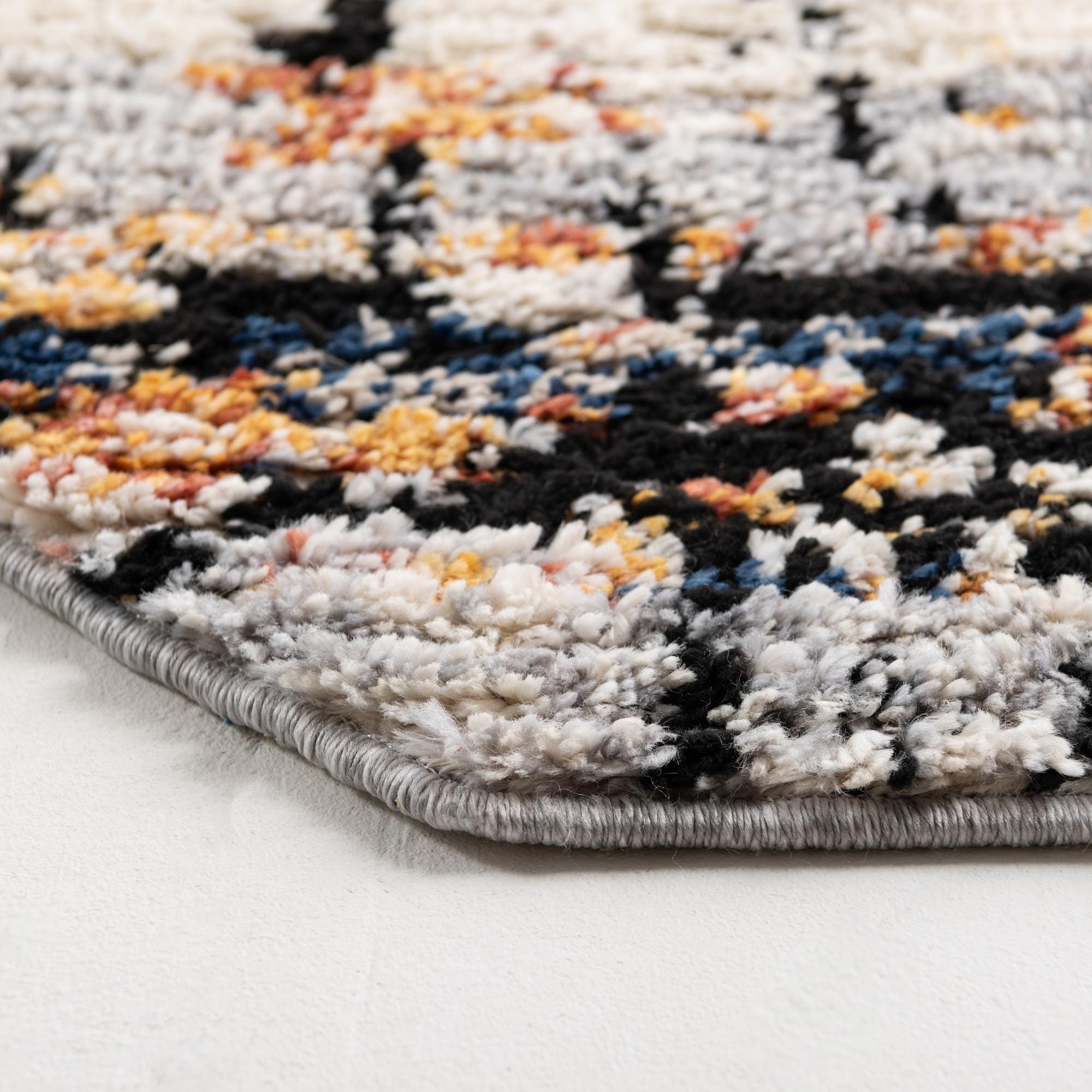 Octagon shag rug with a modern Southwestern pattern in multi-colored hues of orange, blue, black, and cream.