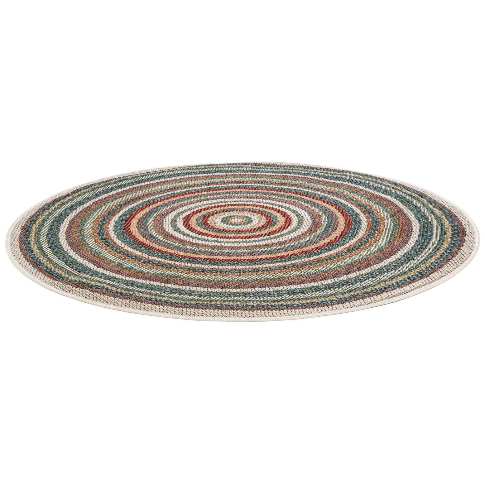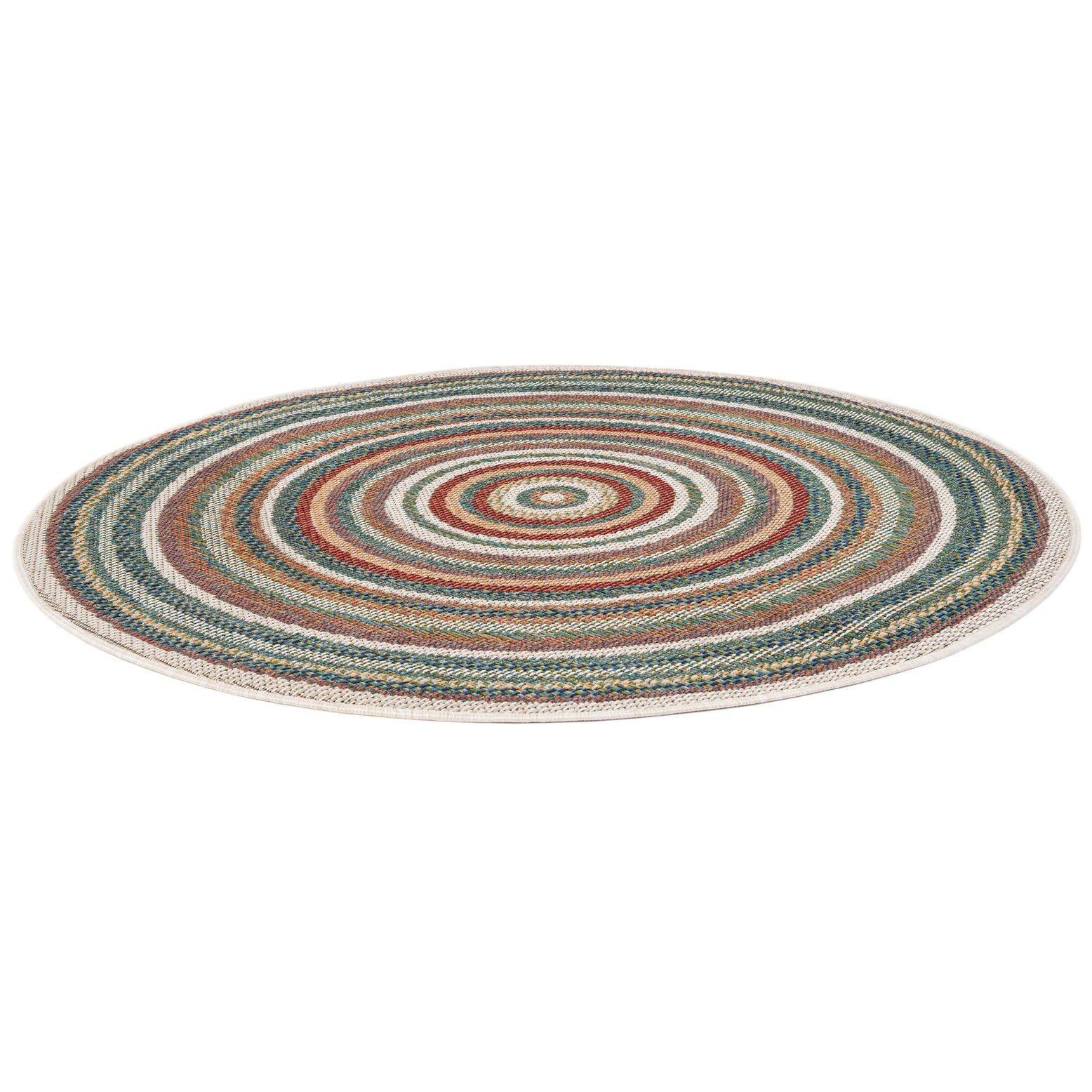 Concentric bands of narrow, woven stripes form a round medallion pattern that draws the eye to the center. The multi background blends brown, green, ivory, navy blue, red, rust red and orange in a tightly braided look, creating a relaxed, layered color effect. Machine-made from 100% polypropylene, the flat, low-profile weave feels slightly textured underfoot and holds color well, giving the rug a casual, approachable presence.