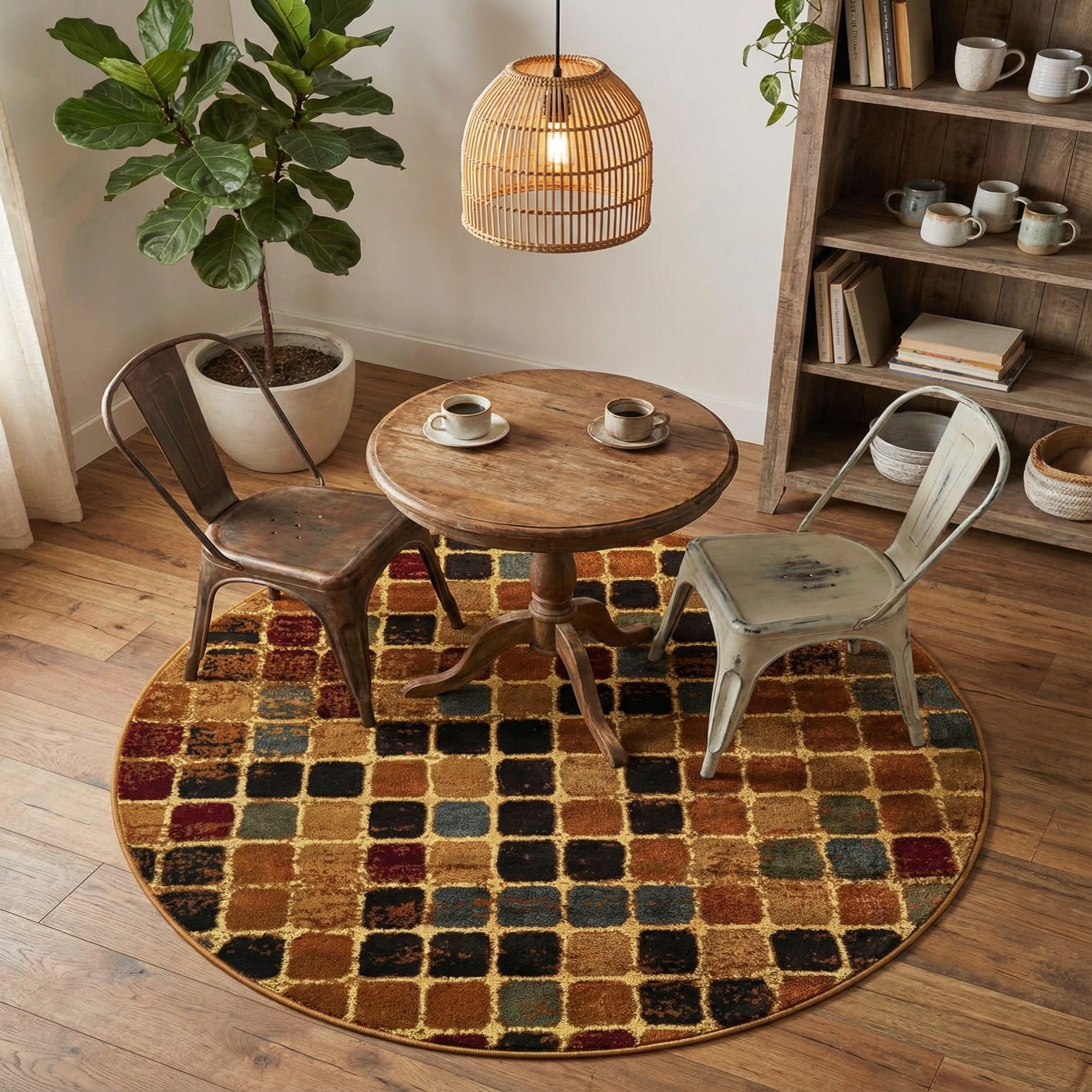 A warm, geometric grid of small squares creates a modern yet lived-in look. Muted gold-beige lines frame a field of multi-colored blocks in brown, beige, gray, olive, maroon and red, with subtle variations and a slightly distressed surface that gives each square visual texture. The round shape softens the pattern and the low-pile, machine-made construction in 100% polypropylene has a smooth, touchable finish with a gentle sheen that highlights the color shifts.