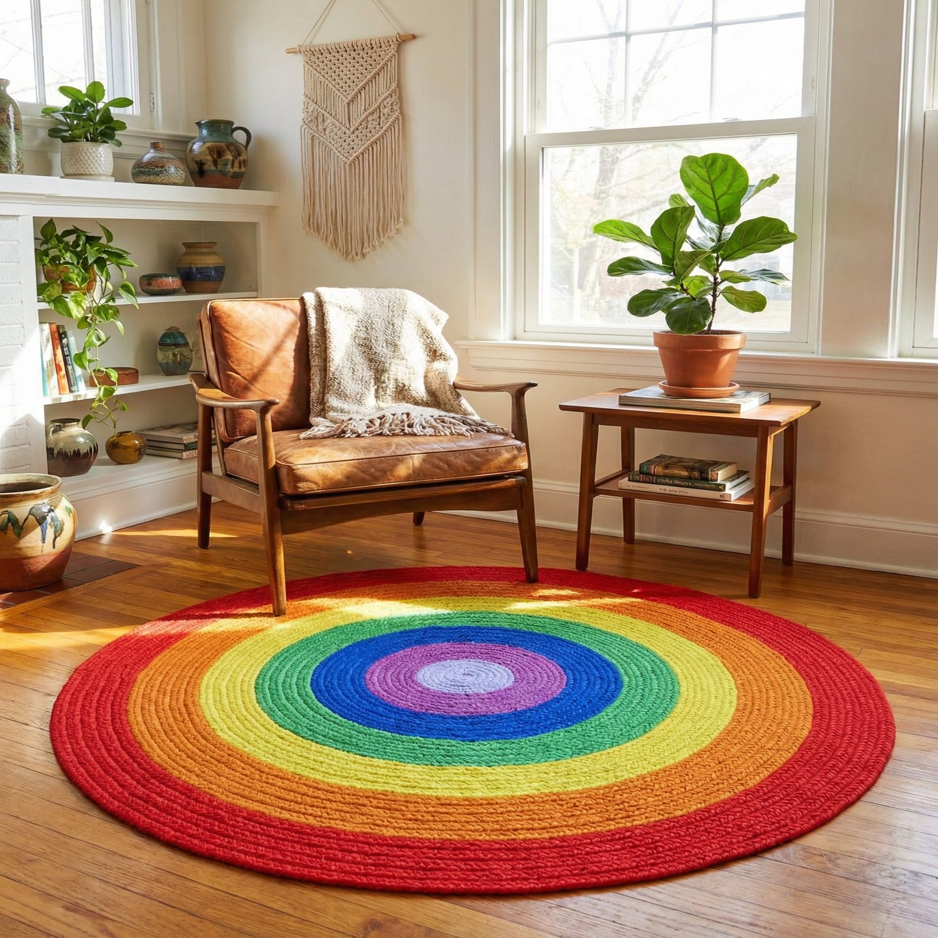 A vibrant 4' 1 round rug with concentric circles in rainbow colors, handmade from braided wool.