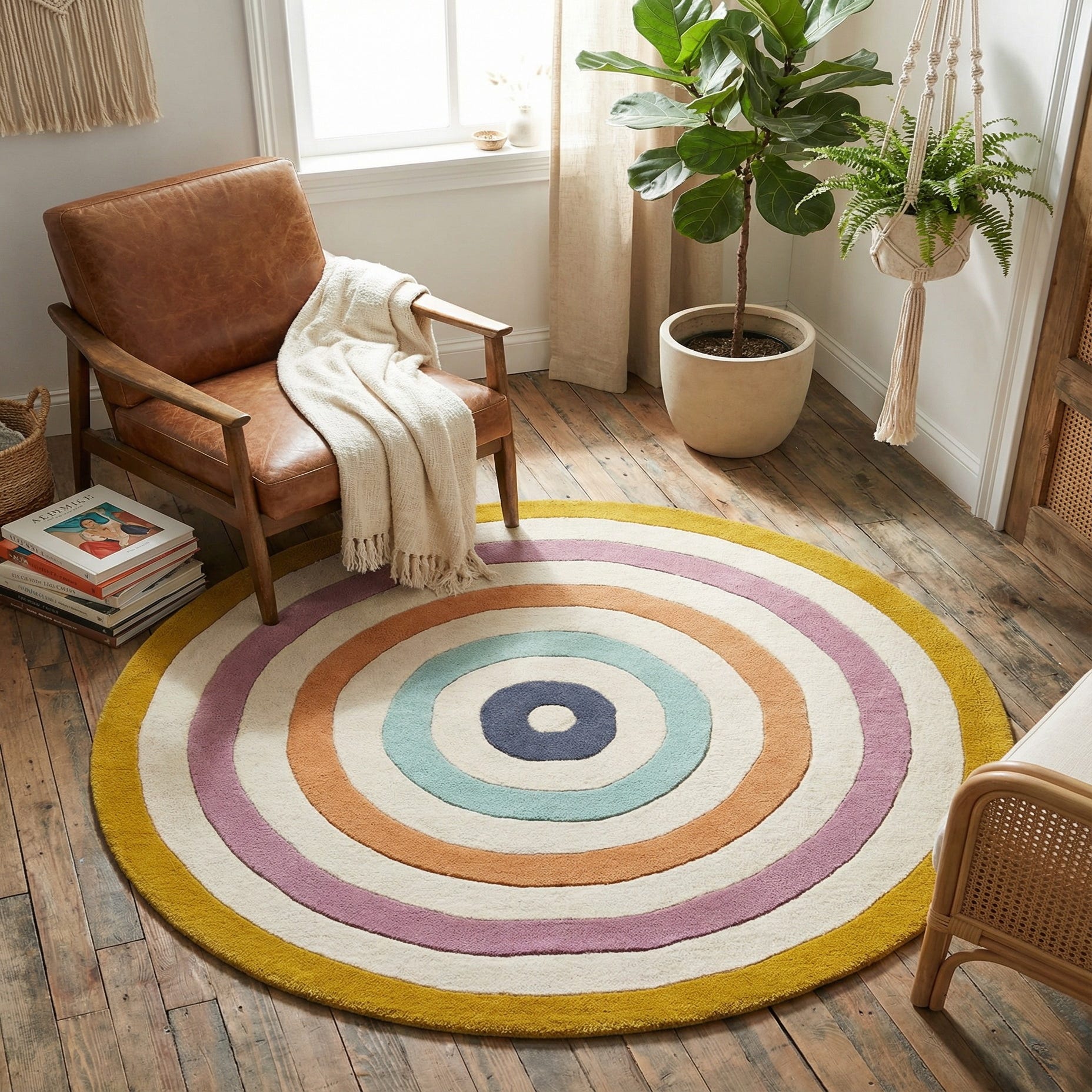 A bold concentric circle motif gives this round rug a lively, contemporary look. Bands of mustard yellow, violet, warm orange, light blue and slate gray alternate with ivory rings across a multi-colored ground, creating a layered, geometric composition that reads fresh and balanced. Hand-tufted from 100% wool, the surface is plush and dense with a soft, slightly springy feel beneath your feet; the hand-tufting produces a subtly sculpted texture that enhances the graphic rings.