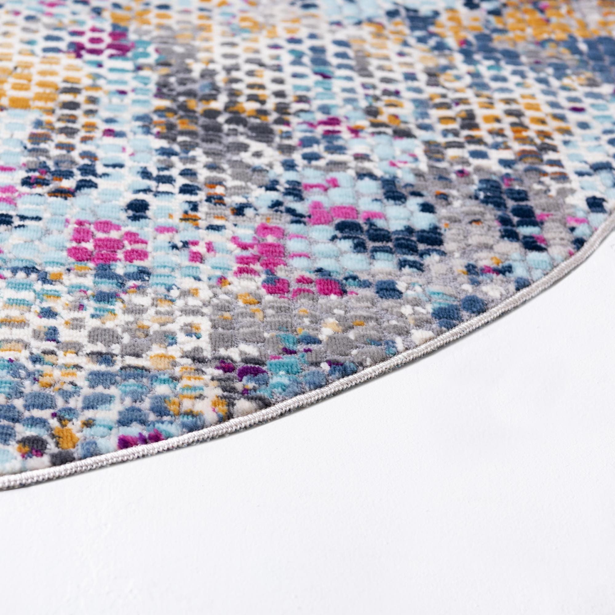 A 3' 7 round multi-colored abstract rug with a textured pile, featuring speckles of blue, orange, pink, and gray.