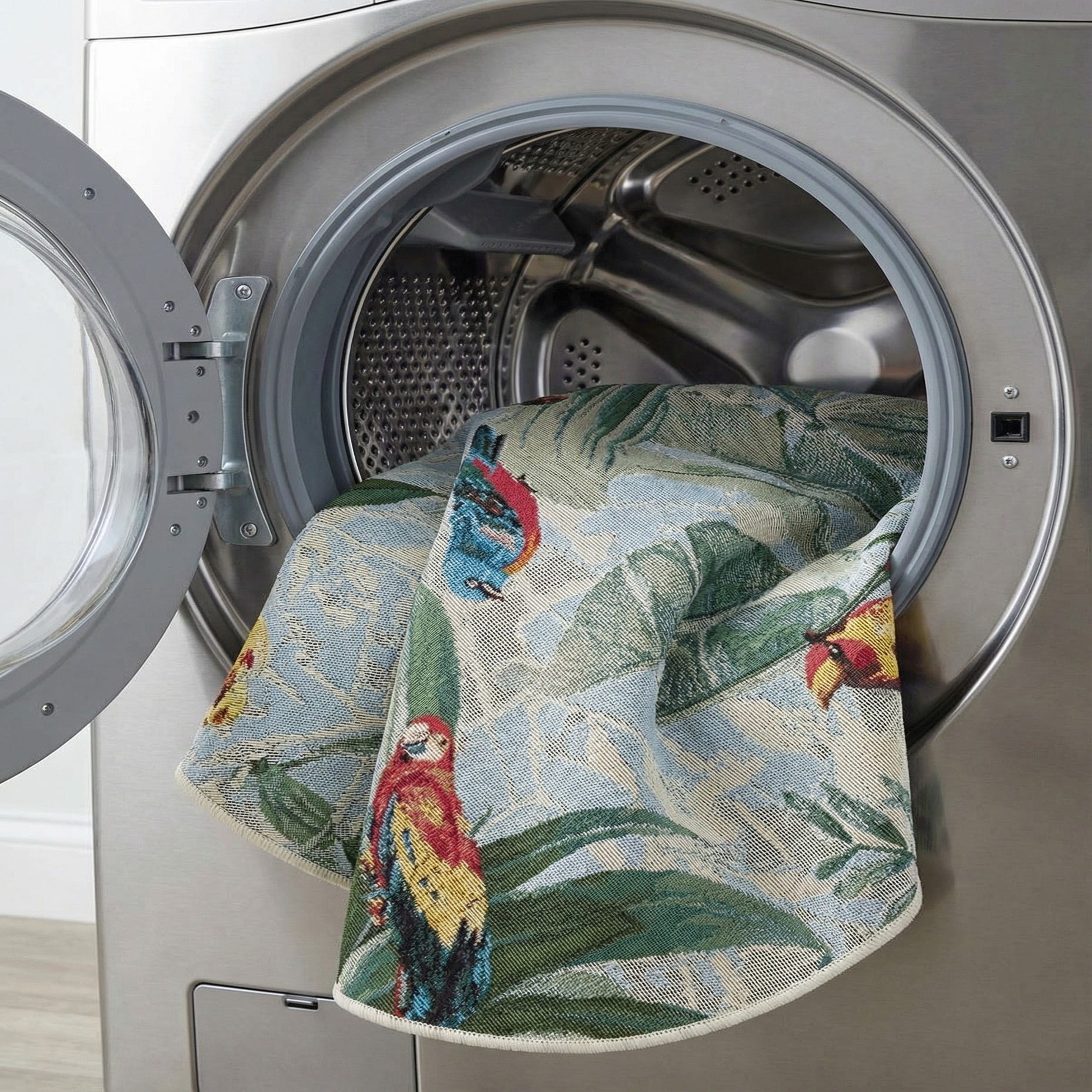 A round outdoor rug with a botanical motif, this piece pairs oversized tropical leaves with an array of colorful birds for a layered, garden-like composition. Leaf tones range from deep green and light green to gray and navy blue, set against a multi-tonal background of light blue and ivory. Pops of red, rust red, yellow, blue and brown appear in the bird accents, while subtle black and gray details add definition. The flat-woven, machine-made surface has a low-profile texture that feels slightly textured underfoot and keeps the woven pattern crisp.