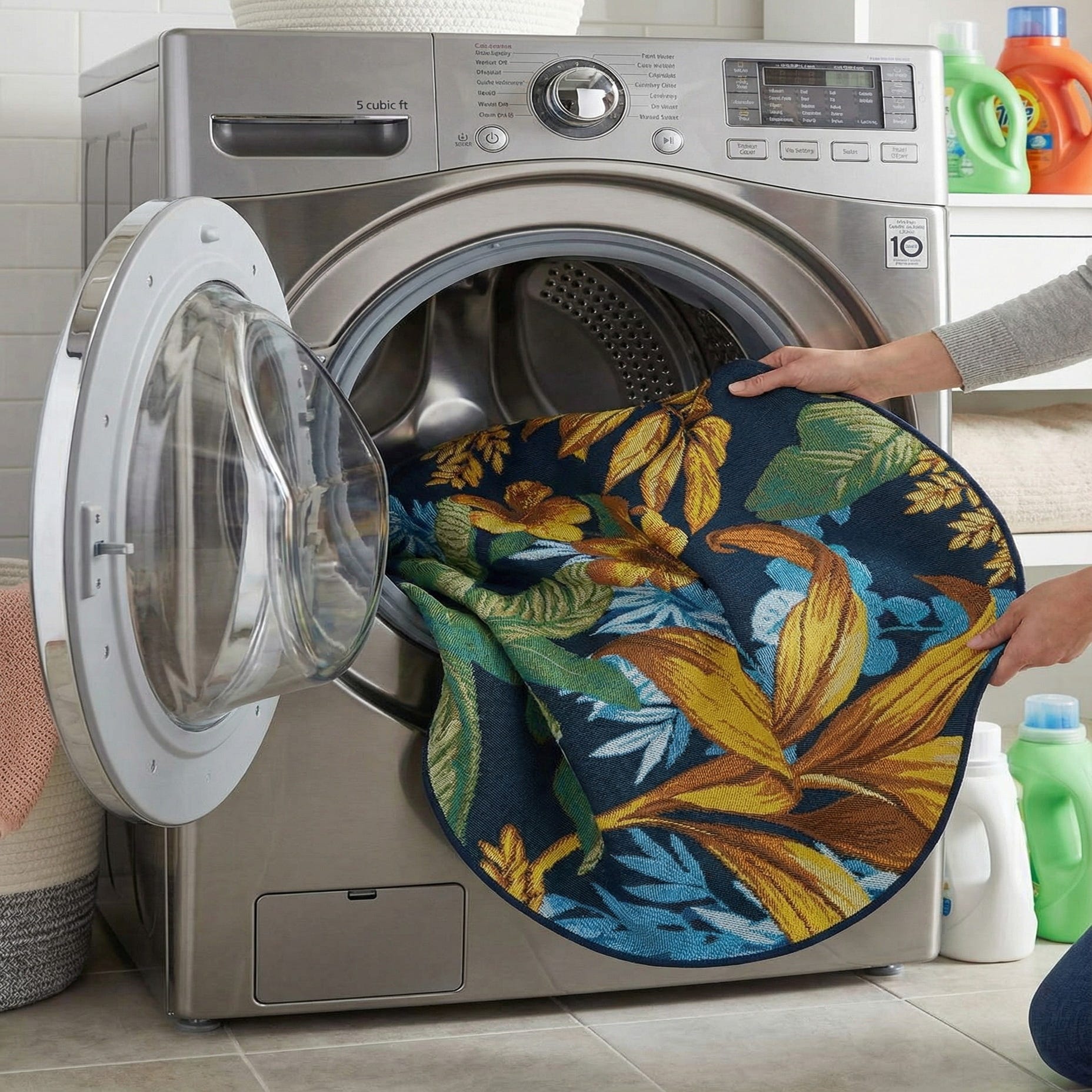A round, multi-colored tropical rug featuring large yellow and green leaves with orange hibiscus flowers on a dark blue background.