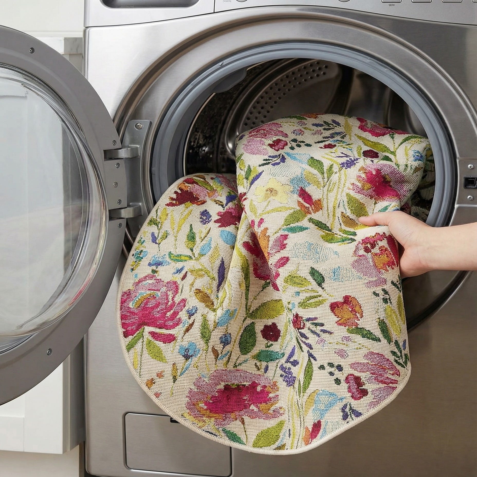 An energetic botanical pattern of painterly blooms and leafy sprigs covers a multi background, bringing an informal garden look to the space. Pinks and reds take center stage alongside soft blues, purples, light and dark greens, sunny yellows and oranges, with small touches of black for contrast. The motifs have a layered, hand-painted quality, and the surface is tightly woven with a smooth, slightly ribbed texture you can feel underfoot. Machine-made of 75% polypropylene and 25% polyester, the construction delivers a balanced combination of color clarity and a comfortable, low-profile hand.