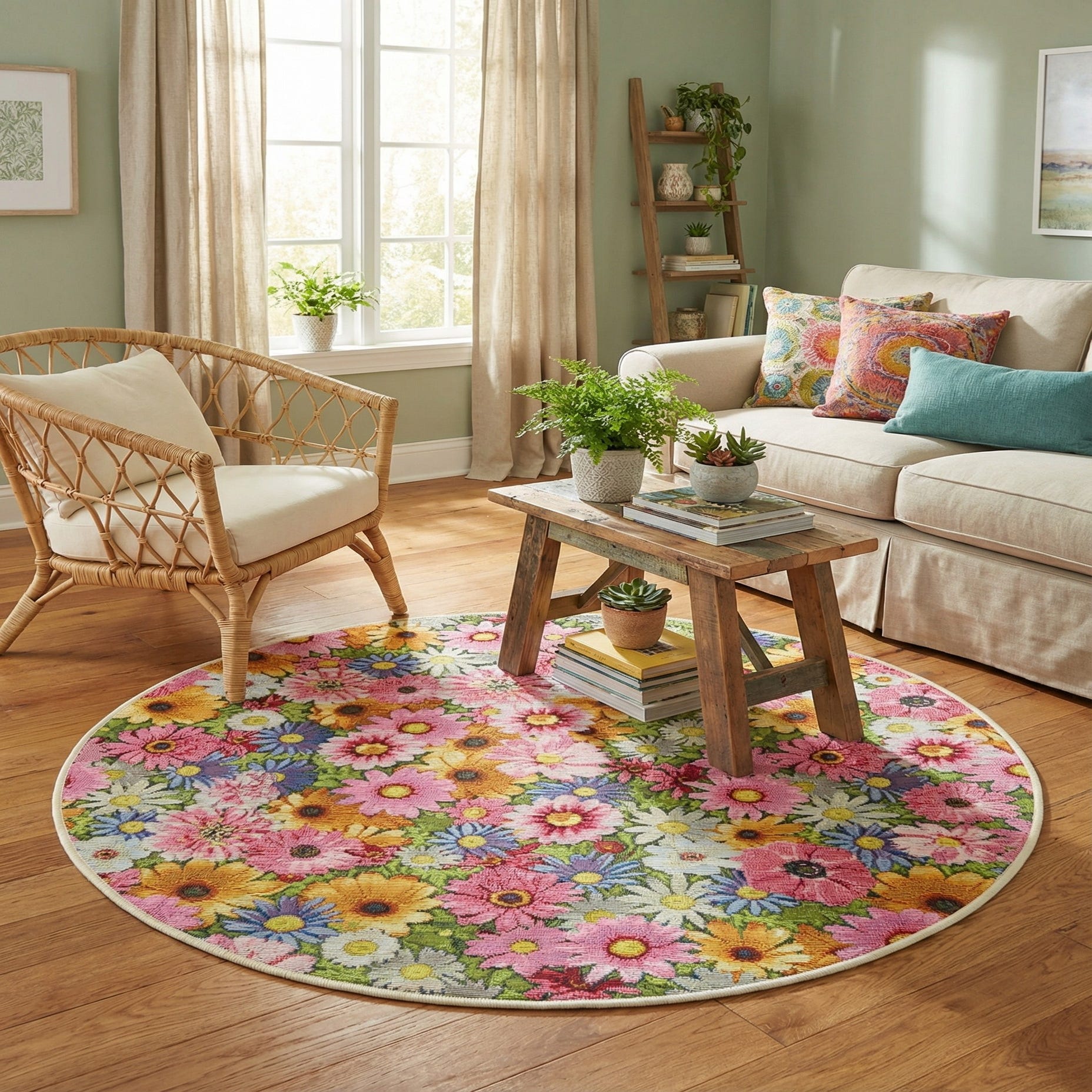A lively, all-over botanical pattern fills this round rug with clusters of daisies and wildflowers in pinks, light blue, red, ivory, and golden browns set against a multi background. Green foliage and small blue and black accents add depth, while the tight machine-made weave renders each petal with clear definition. The surface has a low-profile, slightly textured hand—firm underfoot with a subtle woven feel from the 75% polypropylene and 25% polyester construction.