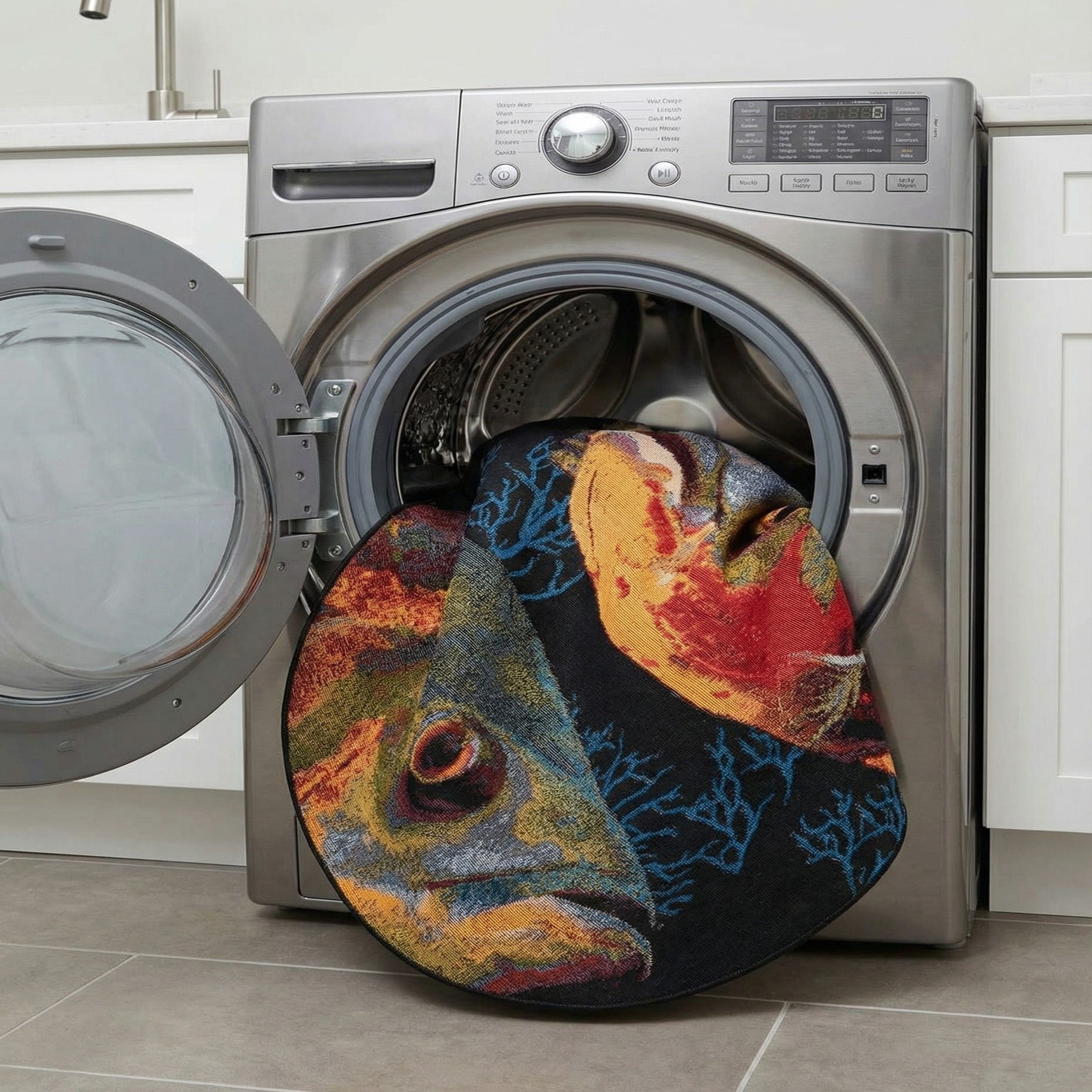 A bold, marine-inspired design puts two painterly fish at the center of this round rug, rendered in layered color fields and fine detailing. The multi background allows deep black areas and navy blue coral accents to sit in high contrast with warm reds, yellows and orange tones on the fish, while olive, brown and gray add subtle depth. Machine made of 100% polypropylene, the rug has a low, tightly woven pile with a slightly textured hand that feels firm underfoot and holds the pattern’s crisp definition.