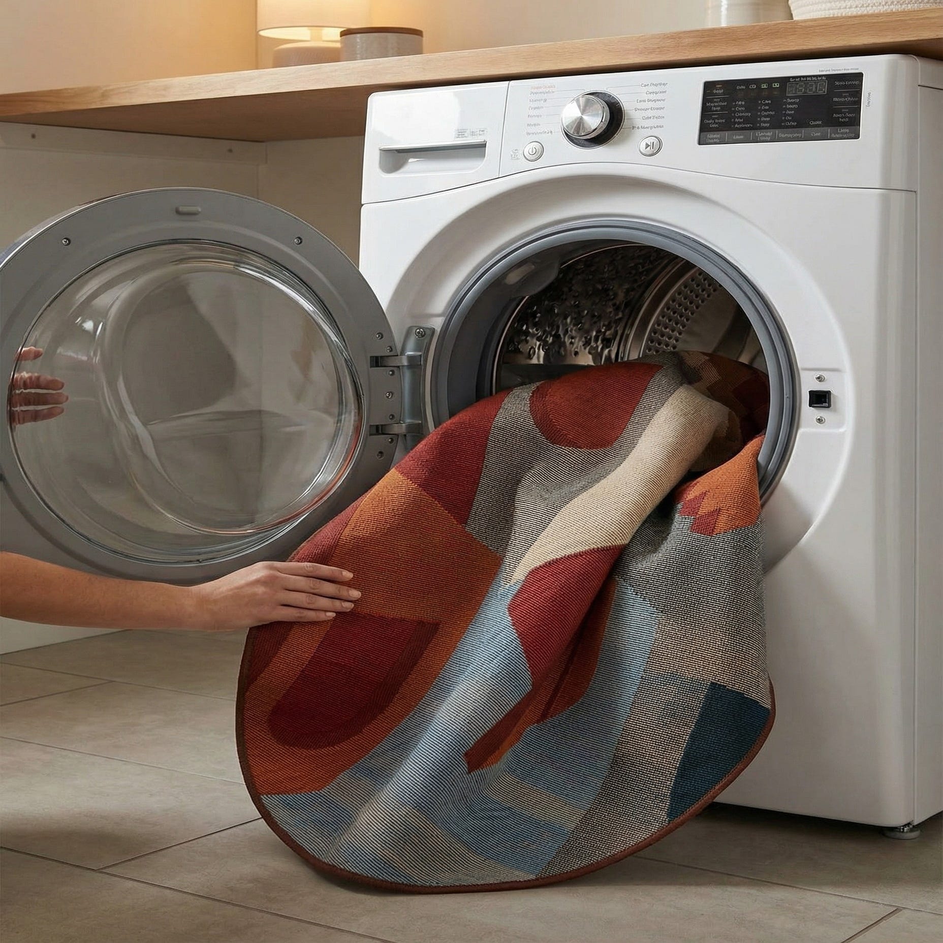 The round shape makes this rug an appealing anchor for small dining nooks, a bistro set on a covered patio, or layered beneath a coffee table in a contemporary living area. Pair it with warm wood finishes, matte black metal, and simple linen or leather seating to echo the palette and emphasize the architectural lines. It also complements mid-century modern and minimalist interiors where the rug’s clean geometry can act as a focal point.