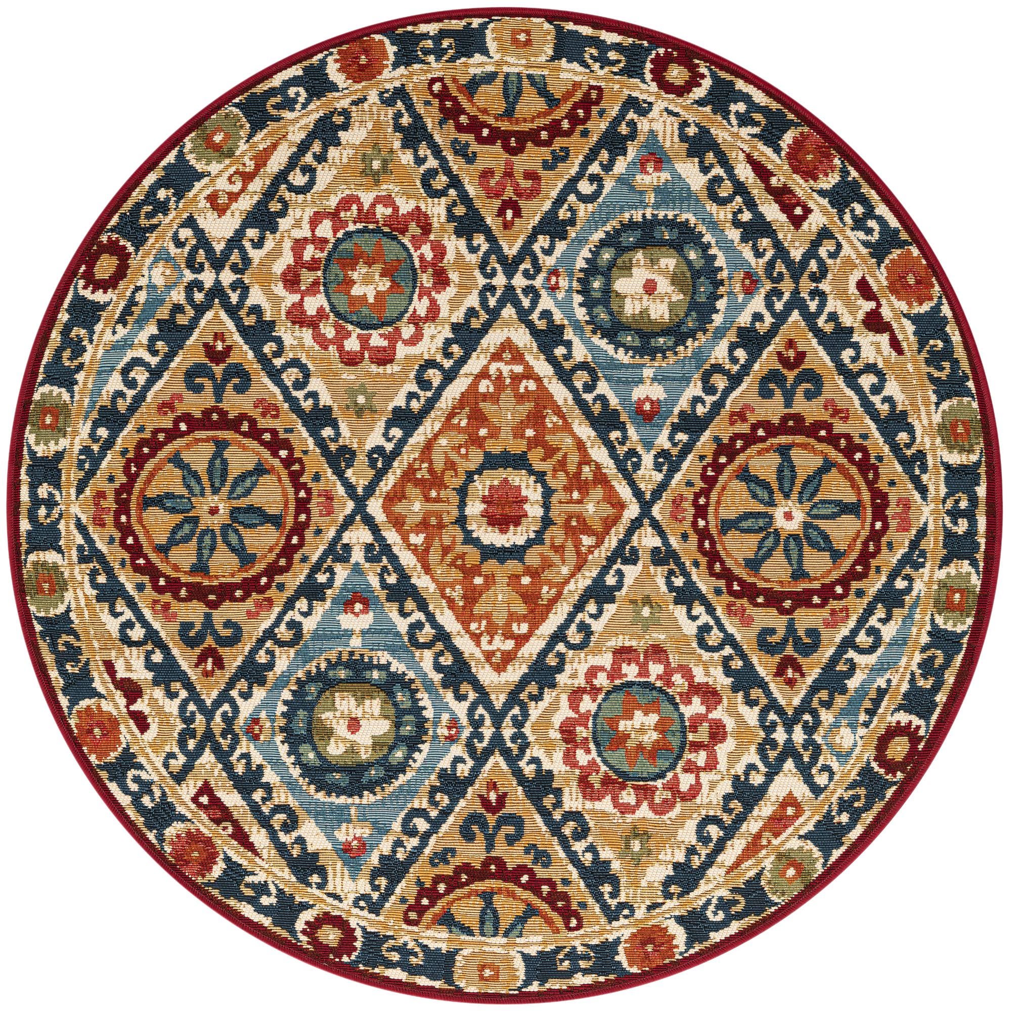 A round rug with a structured diamond trellis of alternating medallions and stylized floral rosettes in warm and cool tones. The background is multi, while navy and ivory outlines define each geometric panel and bring contrast to the design. Rich accents of red, orange, light blue, olive, yellow and brown give the motifs a layered, artisan look. Machine-made from 100% polypropylene, the surface is low-profile with a slightly ribbed texture that feels firm yet comfortable underfoot.