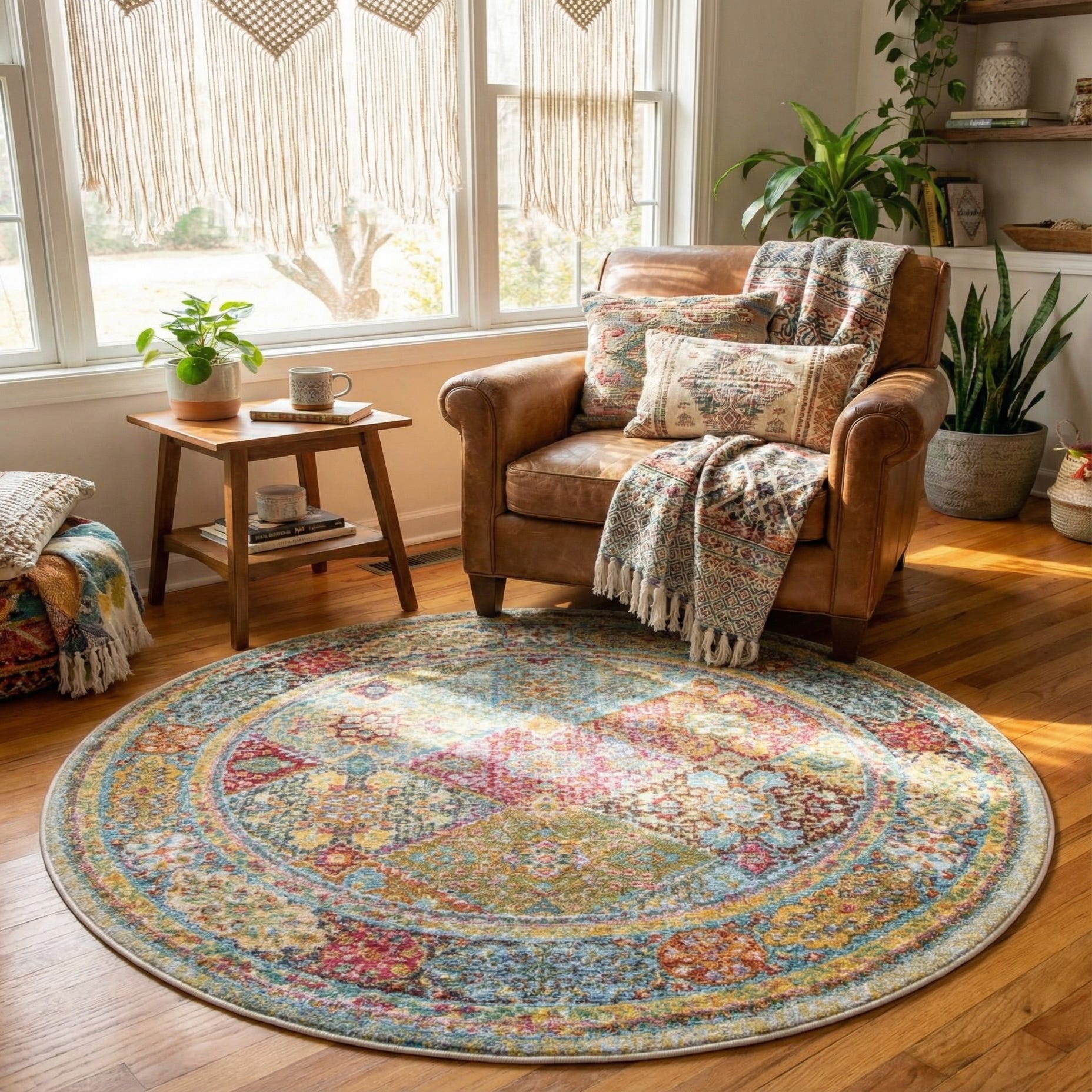 Place this rug to anchor a breakfast nook or a round dining area, tuck it into a cozy reading corner, or layer it over a larger neutral floor covering to add visual interest. It pairs nicely with natural wood and rattan furniture, mid-century silhouettes, or eclectic textiles — equally at home in bohemian, casual traditional, or mixed-style interiors where color and pattern bring the room together.