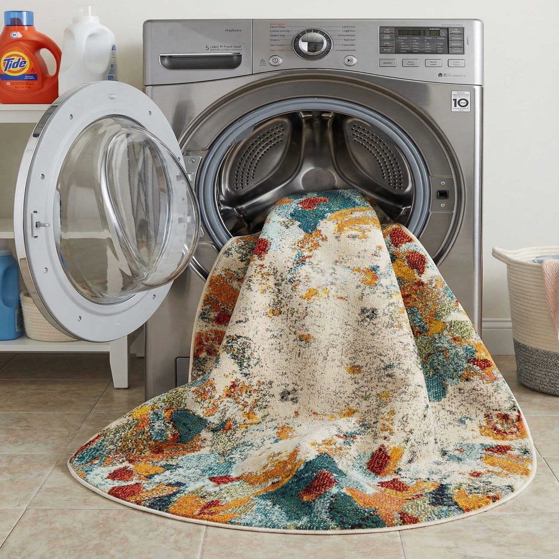 A round, multi-colored abstract rug with an off-white center and splashes of orange, teal, yellow, and red.