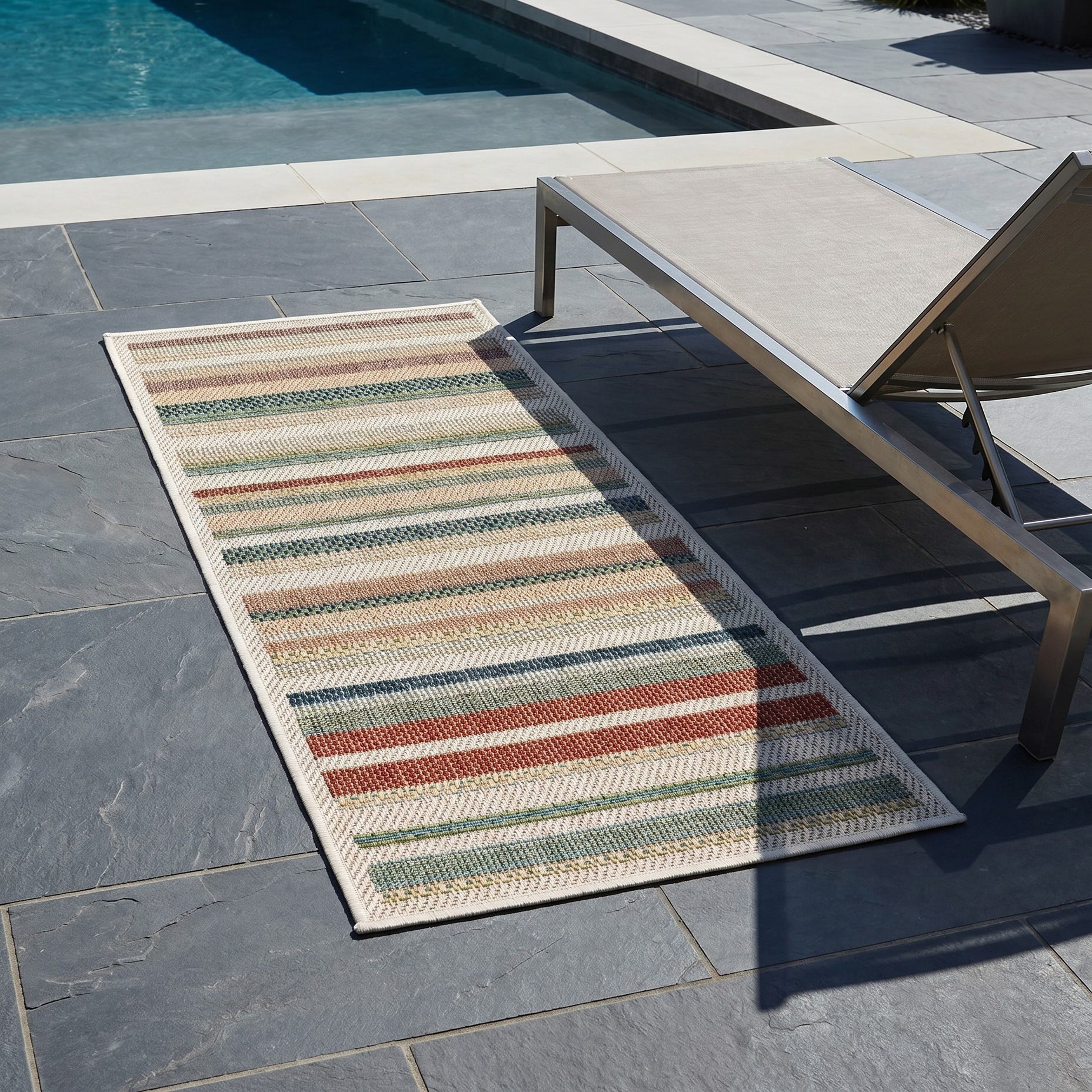 This rug perfectly suits my space and needs. I wanted something durable and colorful. The colors are beautiful; just as pictured! It's made well shipping was quick and the sale price was great. BUT...one problem and it's significant; it came so tightly rolled (inside out) that I have not been able to get it to lay completely flat. Because of the rigid material it's made of (it's an outdoor rug) it's been impossible to handroll it to flatten it. I have laid it out upside down with weights on the ends but even after several weeks the ends still curl up. It's created a tripping hazard. HELP!