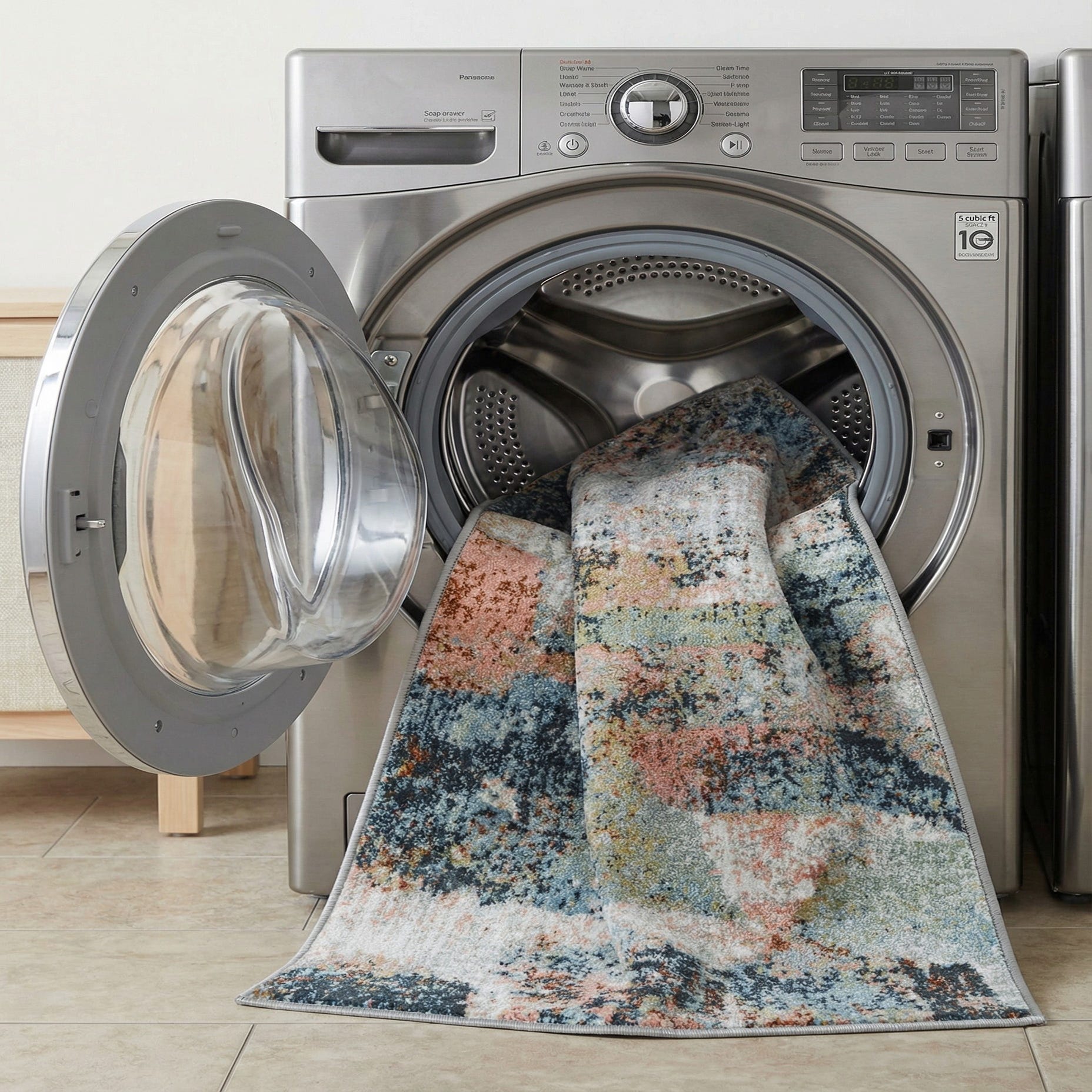 A 4 ft runner rug with a multi-colored abstract pattern featuring shades of blue, pink, grey, and hints of orange, ideal for a hallway.