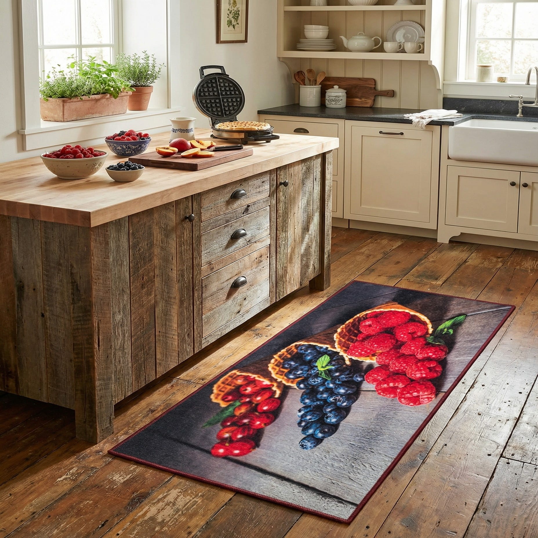 A 4 ft runner rug featuring a vibrant, multi-colored modern design of three waffle cones overflowing with raspberries, blueberries, and cherries on a dark wood background.