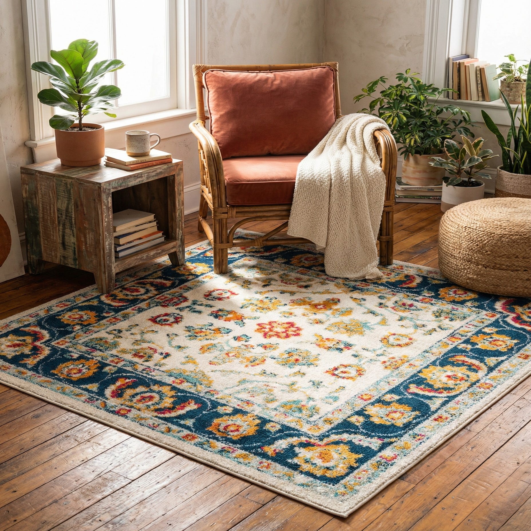 Machine-made from 100% polypropylene, the rug has a soft, low pile that feels pleasant underfoot and layers well over hard floors. Its balanced palette works well in a casual living room to anchor a seating group, beneath a small dining table to add warmth, or in a bedroom and reading nook to introduce pattern and color. The mix of warm terracotta and cool blues makes it easy to pair with natural wood tones, neutral upholstery, or painted furniture for a collected, lived-in feel.