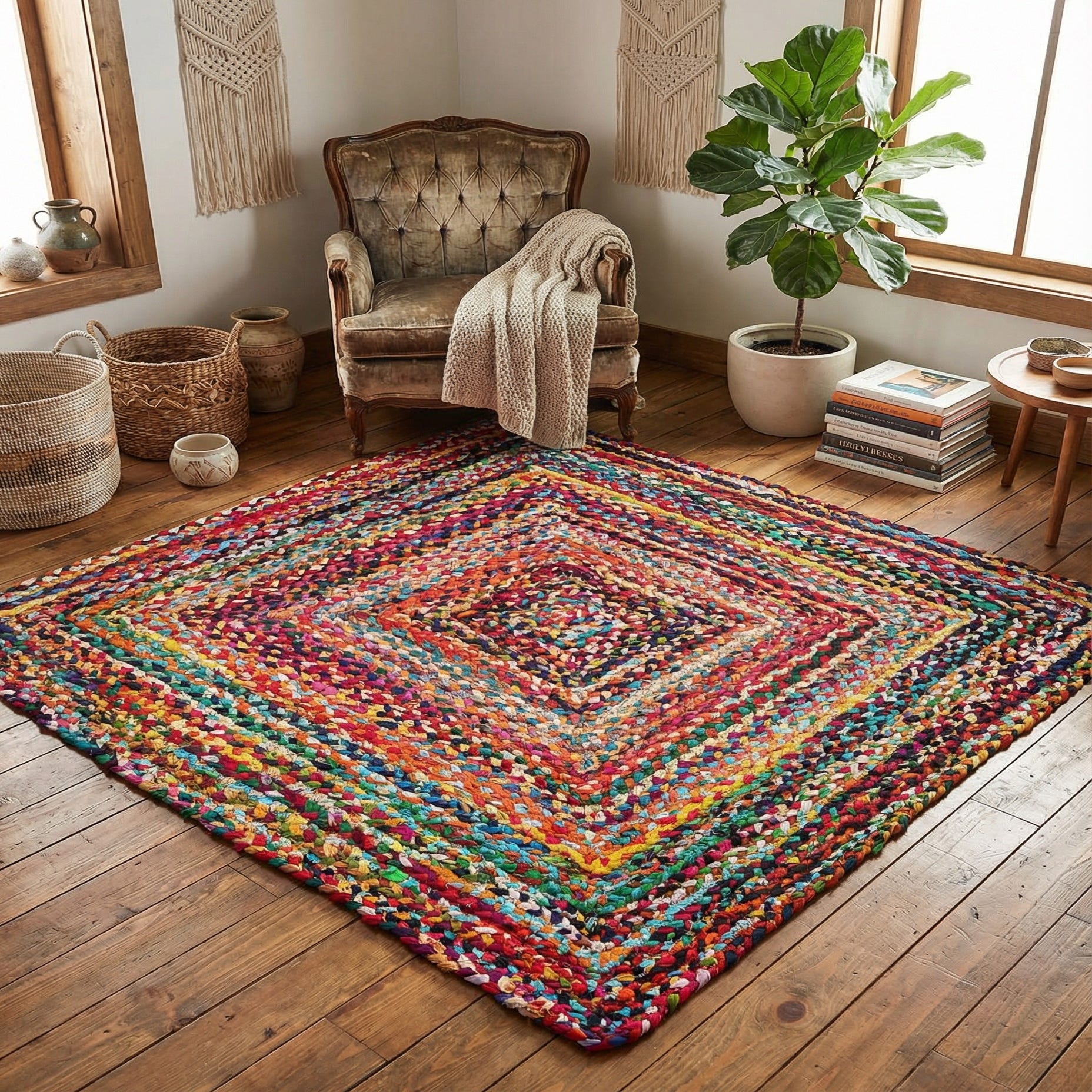 Hand-braided from 100% cotton, this square rug presents a concentric braided pattern that layers bands of color into neat, textured squares. The background is multi, with interwoven hues of blue, navy, green, gold, cream, brown, orange, purple, red and pink creating lively contrast and visual depth. The braided construction produces a low, cushioned surface with a tactile, hand-crafted feel—each fabric strip and twist is visible to the eye and pleasant to the touch.