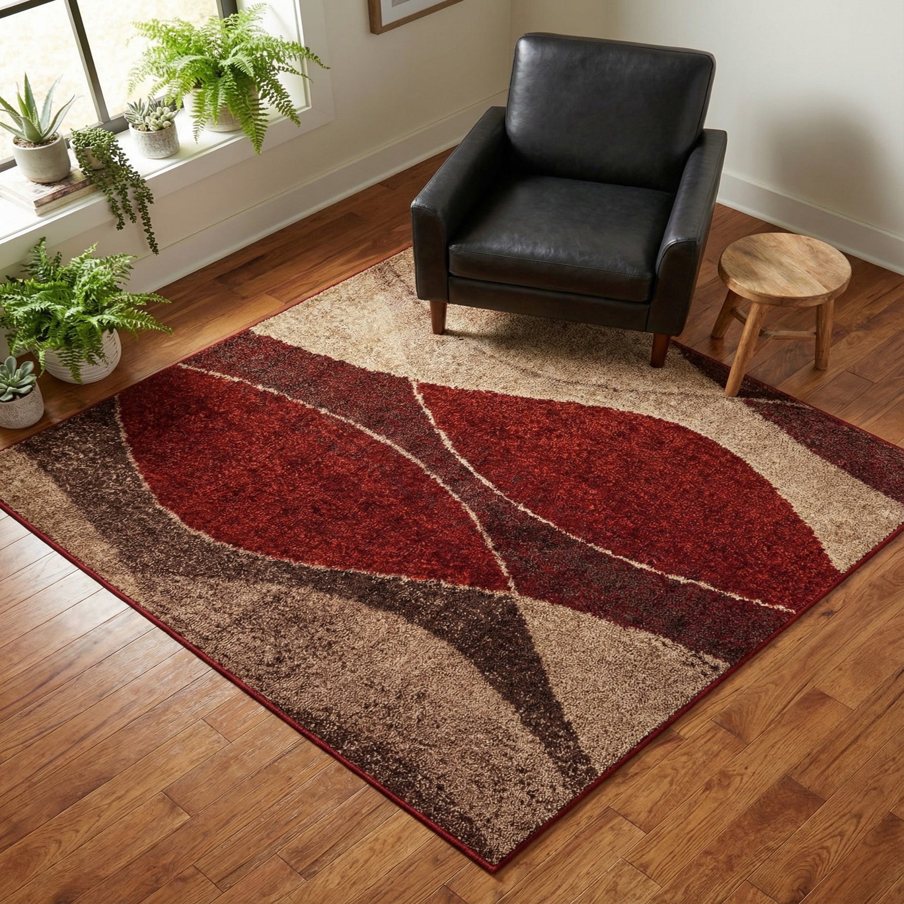 Machine-made from 100% polypropylene, this rug has a dense, cut-pile surface with subtle high-low texturing you can feel underfoot. The pattern is an abstract, organic composition of overlapping curved leaf-like forms rendered in deep burgundy and warm orange, set against beige and brown bands on a multi background. The result is a modern, sculptural look that combines bold color blocks with softer, tonal fields.