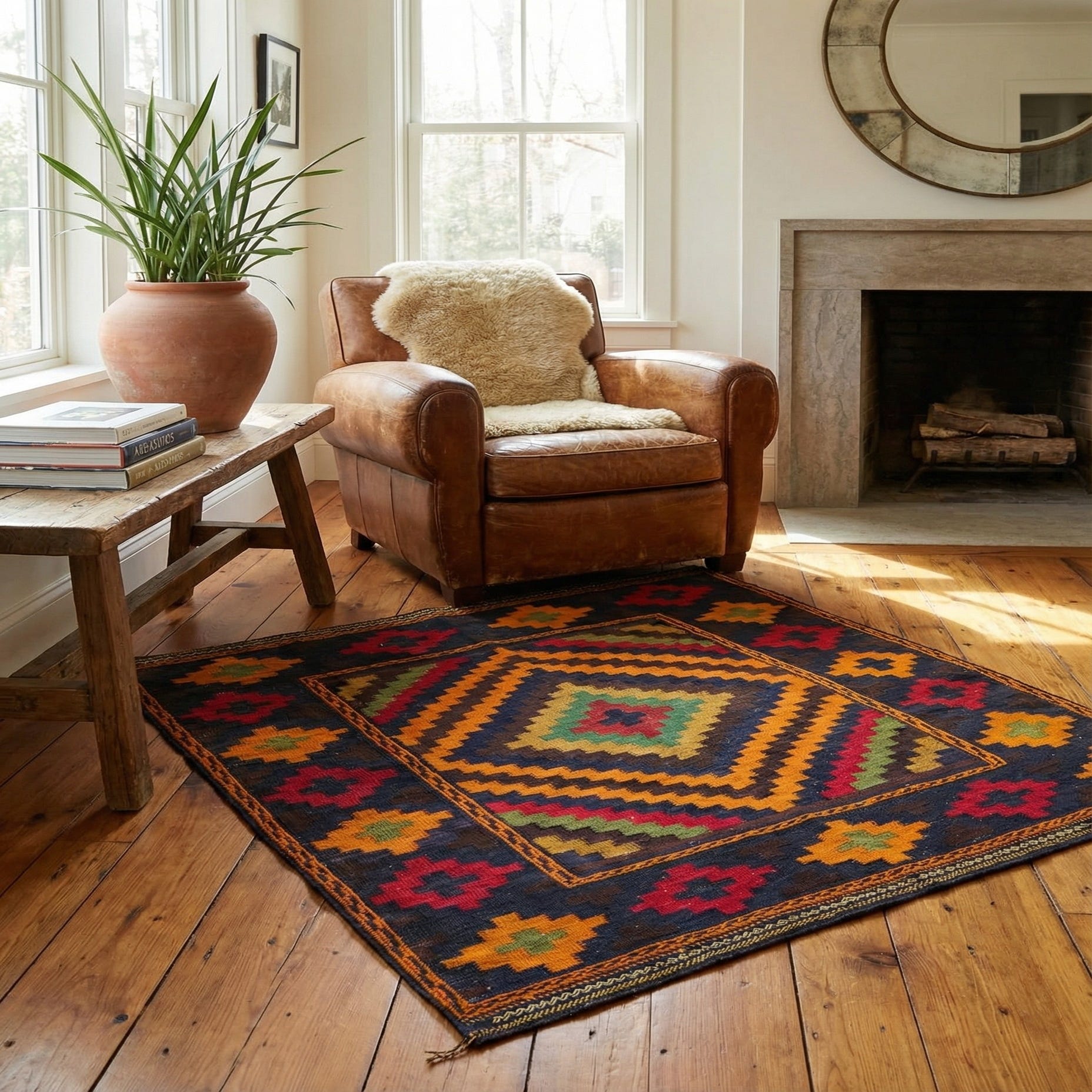 A 3'10 x 4'0 square Kilim Fars rug with a multi-colored tribal medallion pattern on a dark background.