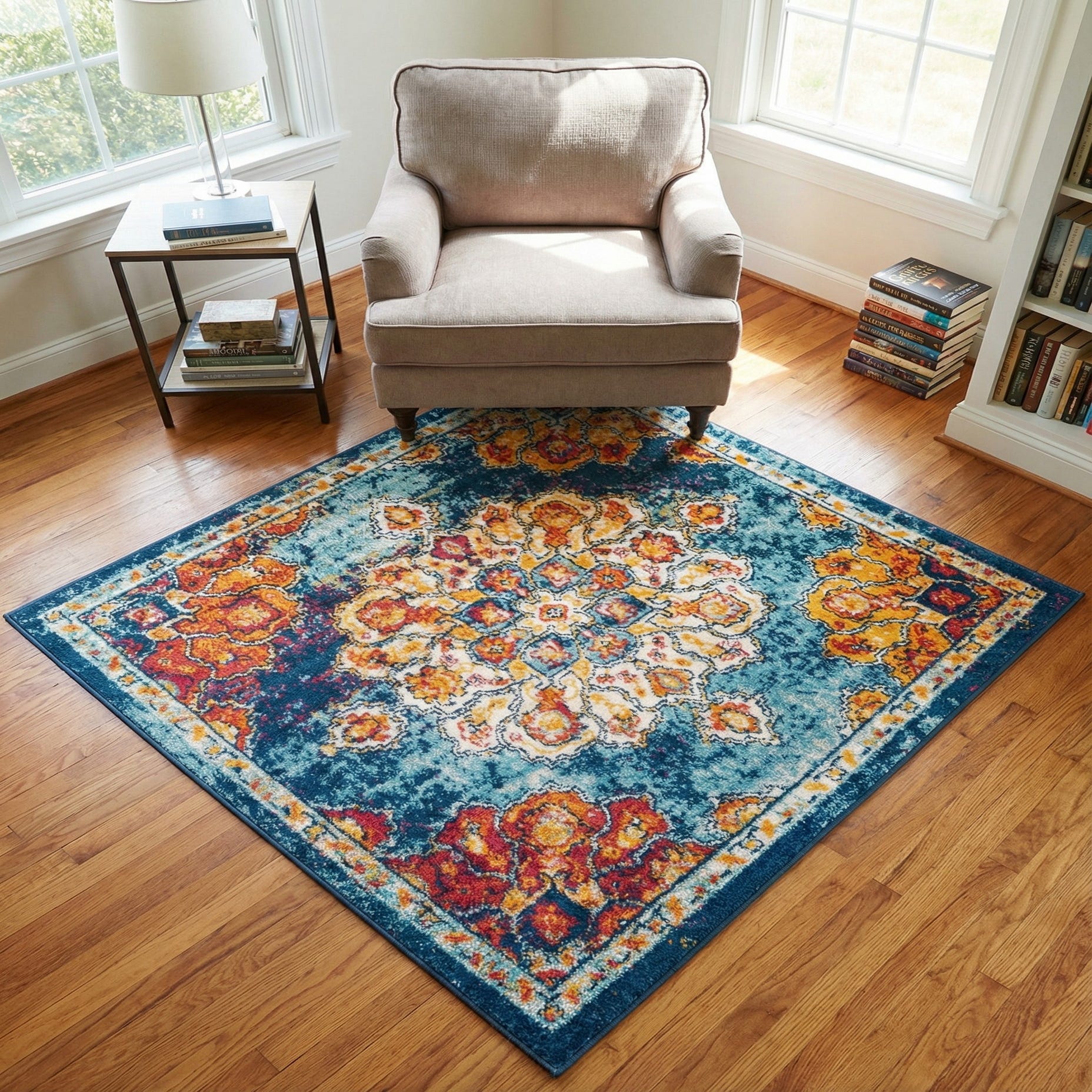 A bold central medallion anchors this square rug, its ivory and golden-yellow motifs outlined with warm reds and oranges and set against a multi-tonal blue and teal field. Painterly floral accents fill the corners and a narrow decorative border contains the design, creating a balanced mix of traditional medallion work and a slightly distressed, modern finish. Machine-made of 100% polypropylene, the rug has a low-to-medium pile that feels soft underfoot and shows a subtle sheen where the yarn catches the light, giving texture and depth to the pattern.
