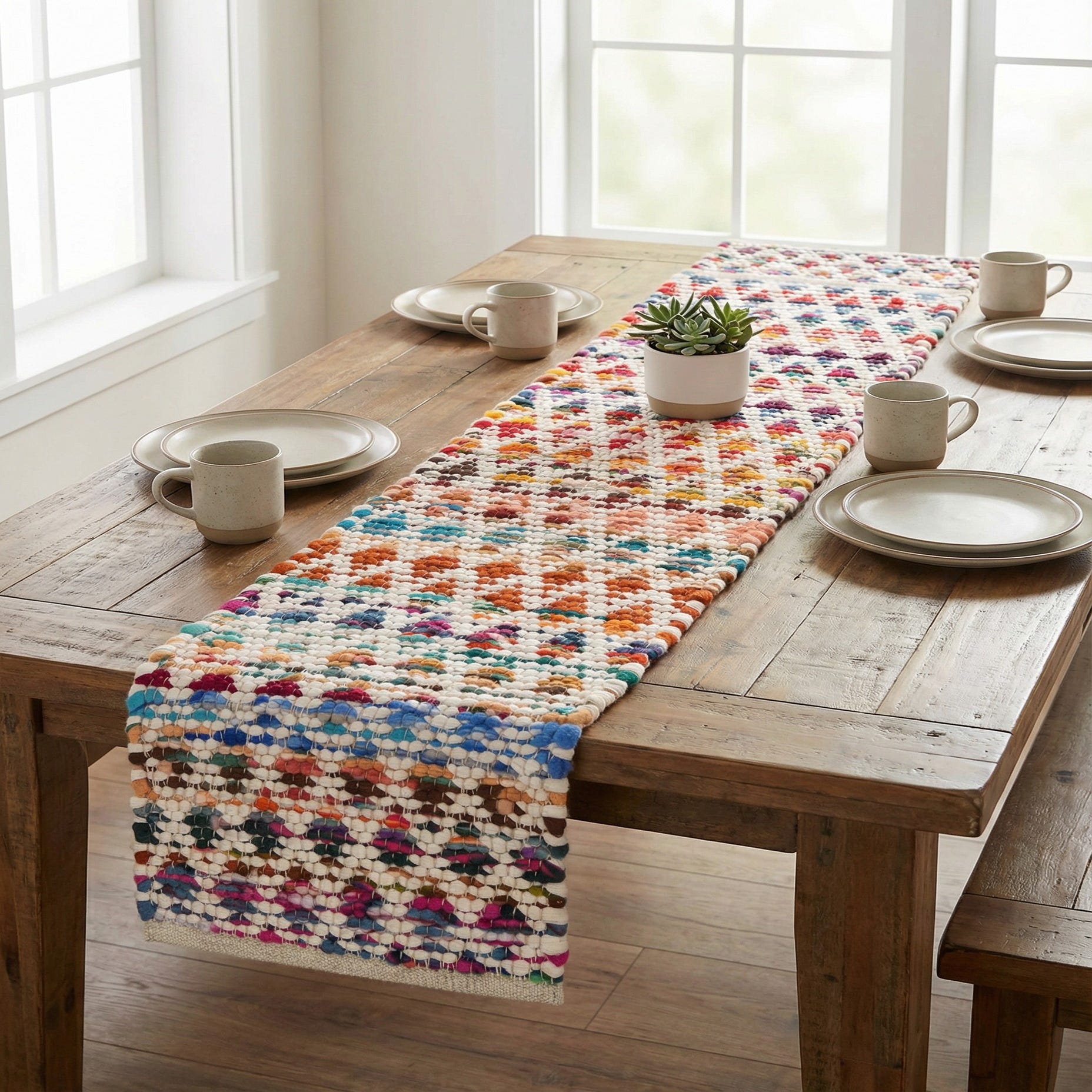 This runner adds color and texture to narrow surfaces such as dining tables, console tables, benches, or sideboards. It pairs well with reclaimed wood and neutral linens for a modern farmhouse look, mixed-pattern textiles and plants for a bohemian or global-inspired scheme, or simple ceramic and brass accents when you want a lively focal strip without overwhelming the room.
