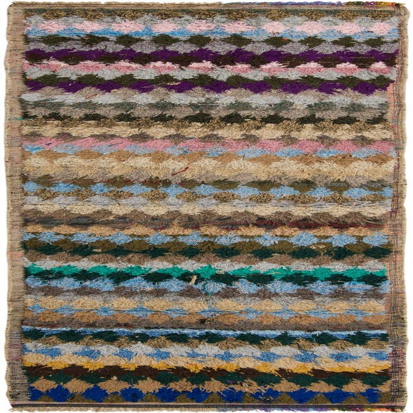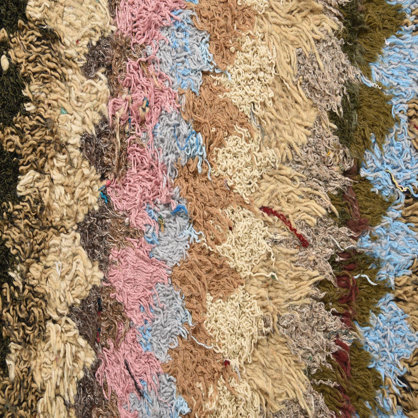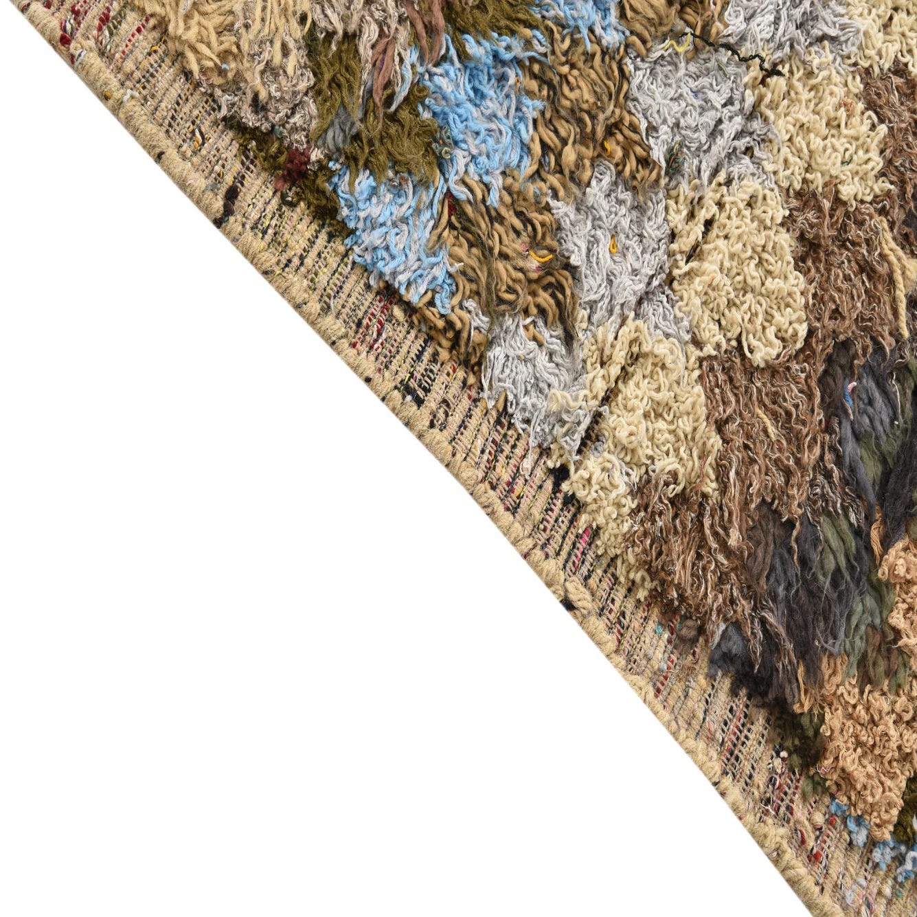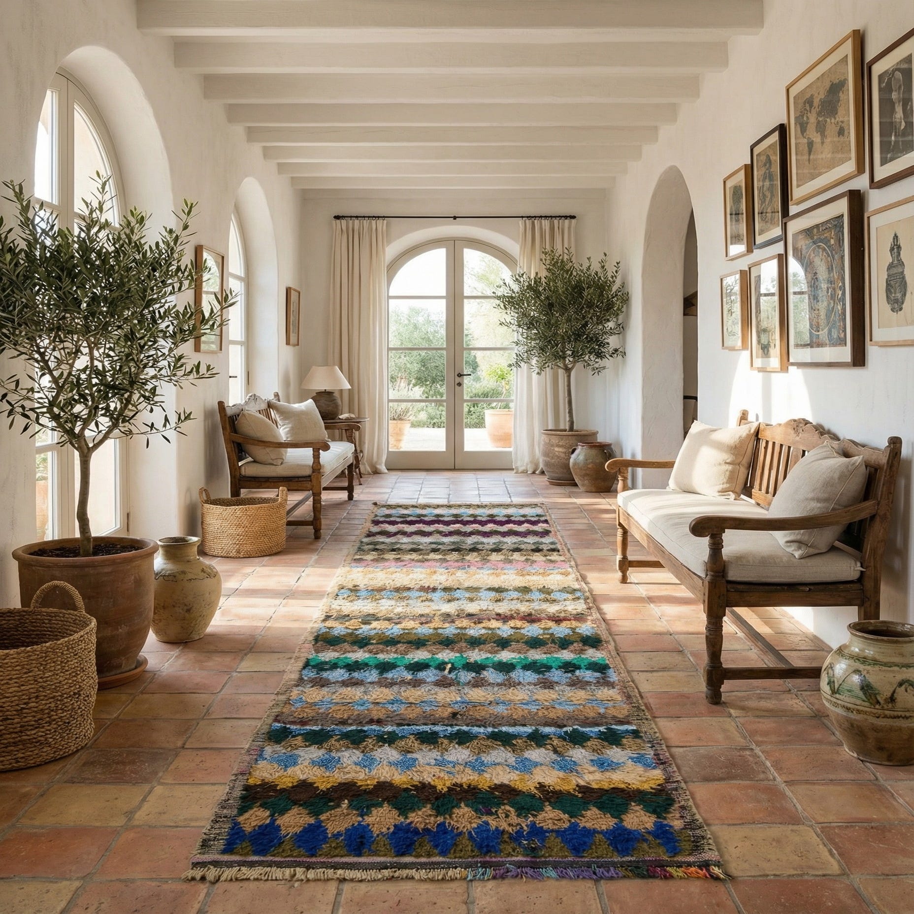 The pile is shaggy and tactile, with long wool strands that create a soft, textured surface underfoot and a slightly uneven, handcrafted character. The hand-knotted construction and finished edges contribute to a substantial, layered look that works well in narrow spaces: hallways, long entryways, galley kitchens, or alongside a bed. Style pairings include warm wood floors and neutral upholstery to let the colors pop, or eclectic and bohemian rooms where mixed textiles and layered rugs add depth. It also complements modern interiors when used as a color-rich accent to ground a minimalist palette.