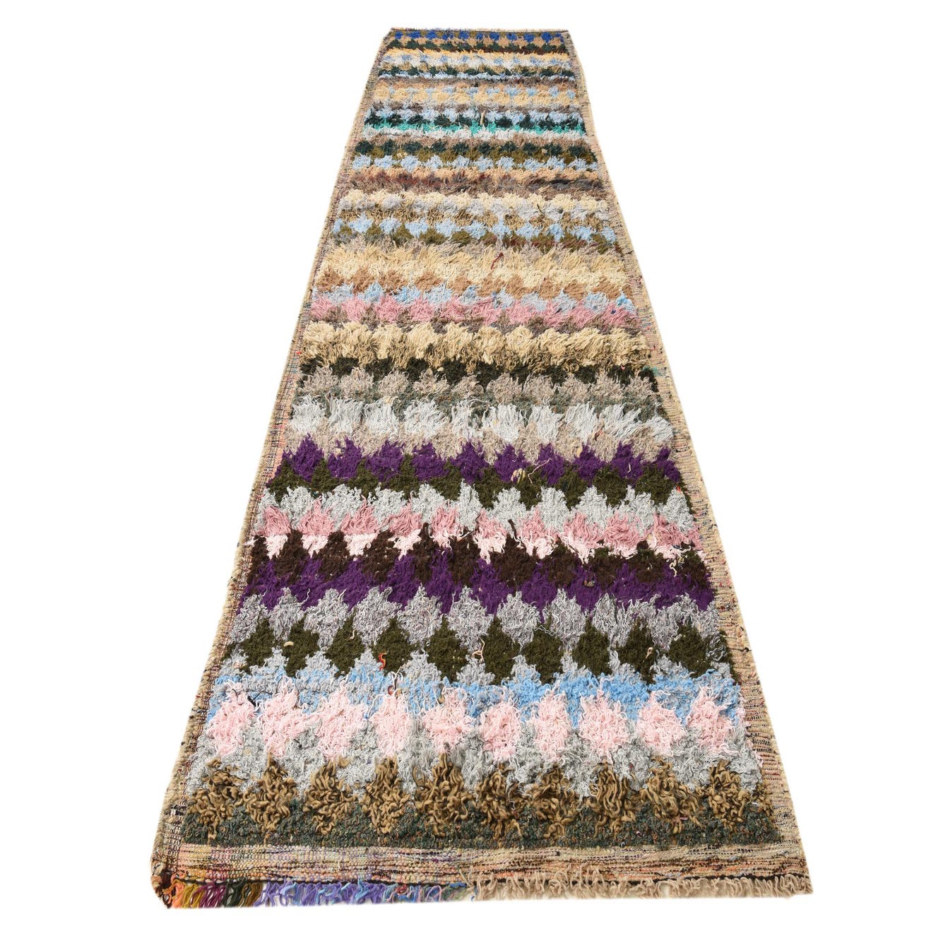 Hand-knotted of 100% wool, this long runner pairs a traditional geometric lozenge motif with a lively, multicolored ground. Rows of small diamond shapes form horizontal bands that move through a broad palette—beige, black, blue, brown, gold, gray, green (including hunter green and olive), navy blue, purple, pink, light blue, light brown and light green—against a multi-colored background. The pattern feels crafted rather than repetitive, with subtle color shifts that give the piece visual movement along its length.