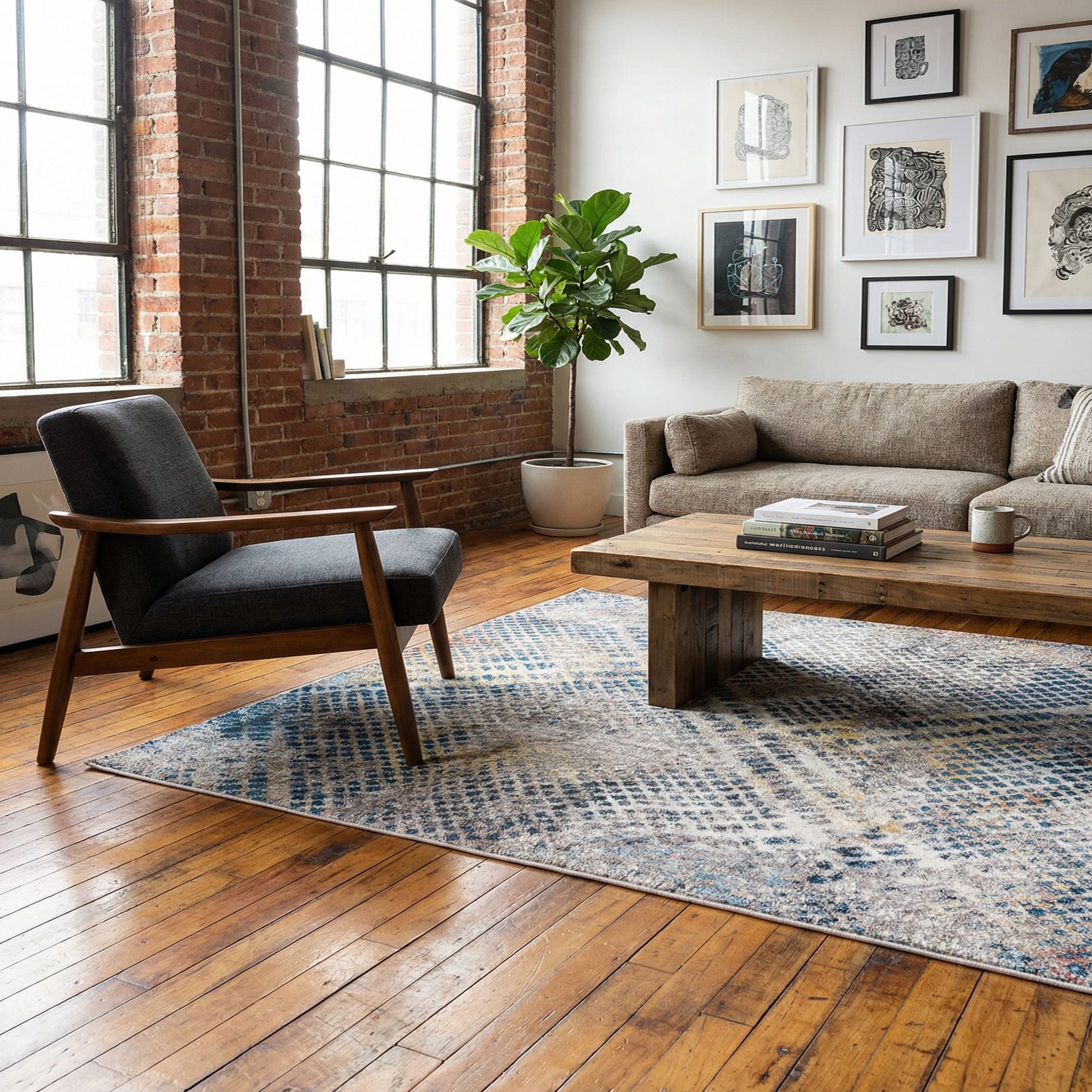 Primary color is Multi. Colors in this rug include: Multi, Beige, Black, Blue, Ivory, Light Blue, Navy Blue, Gray.