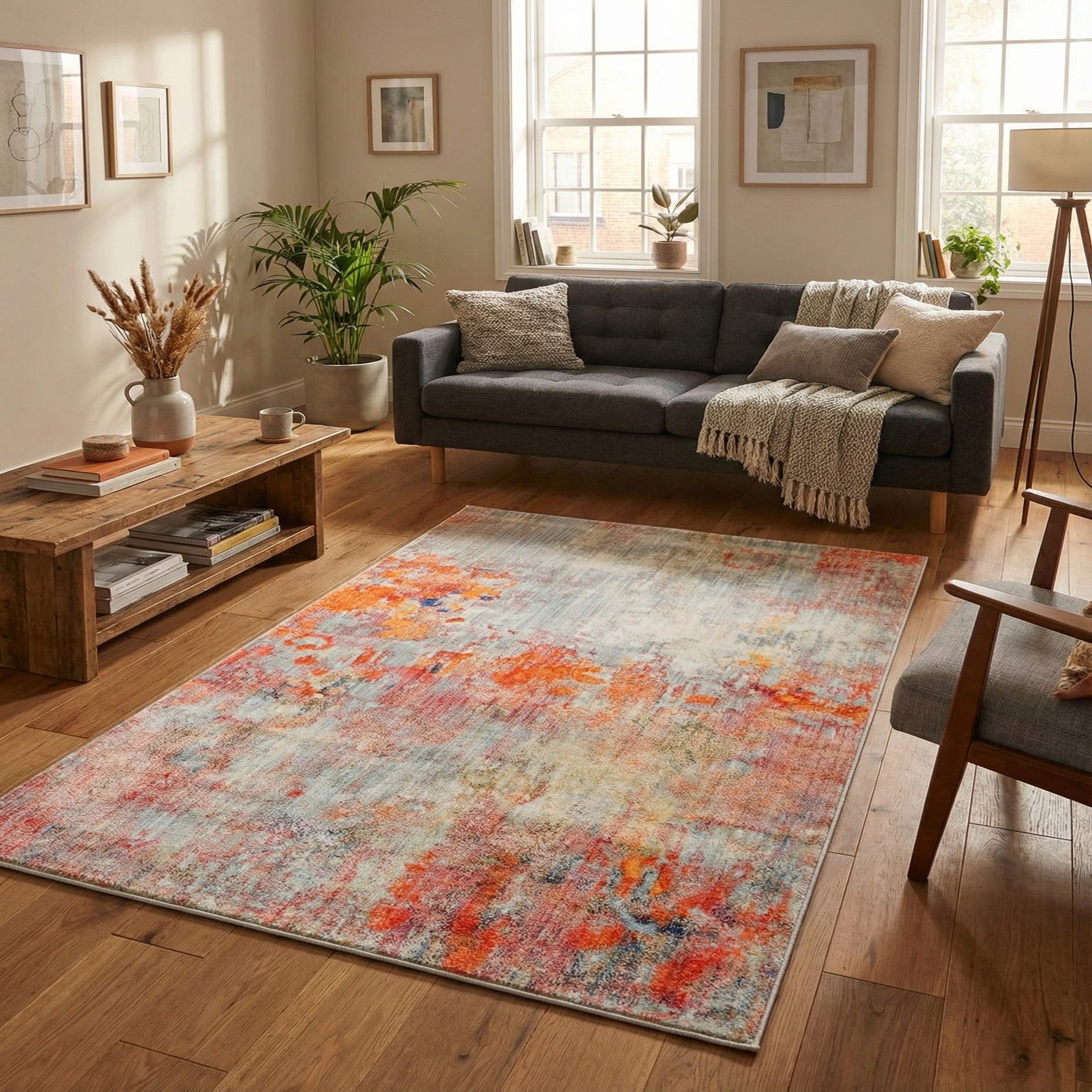 A painterly, abstract design washes across a multi background, where soft bands of ivory and light blue form a subtle, sun-bleached base while warm tones bloom across the field. Pops of orange and red sit alongside touches of pink and gold, with hints of light brown, beige and light green woven into the composition for added depth. The overall effect is a layered, artful look that balances vibrant color accents with a gentle, lived-in palette.