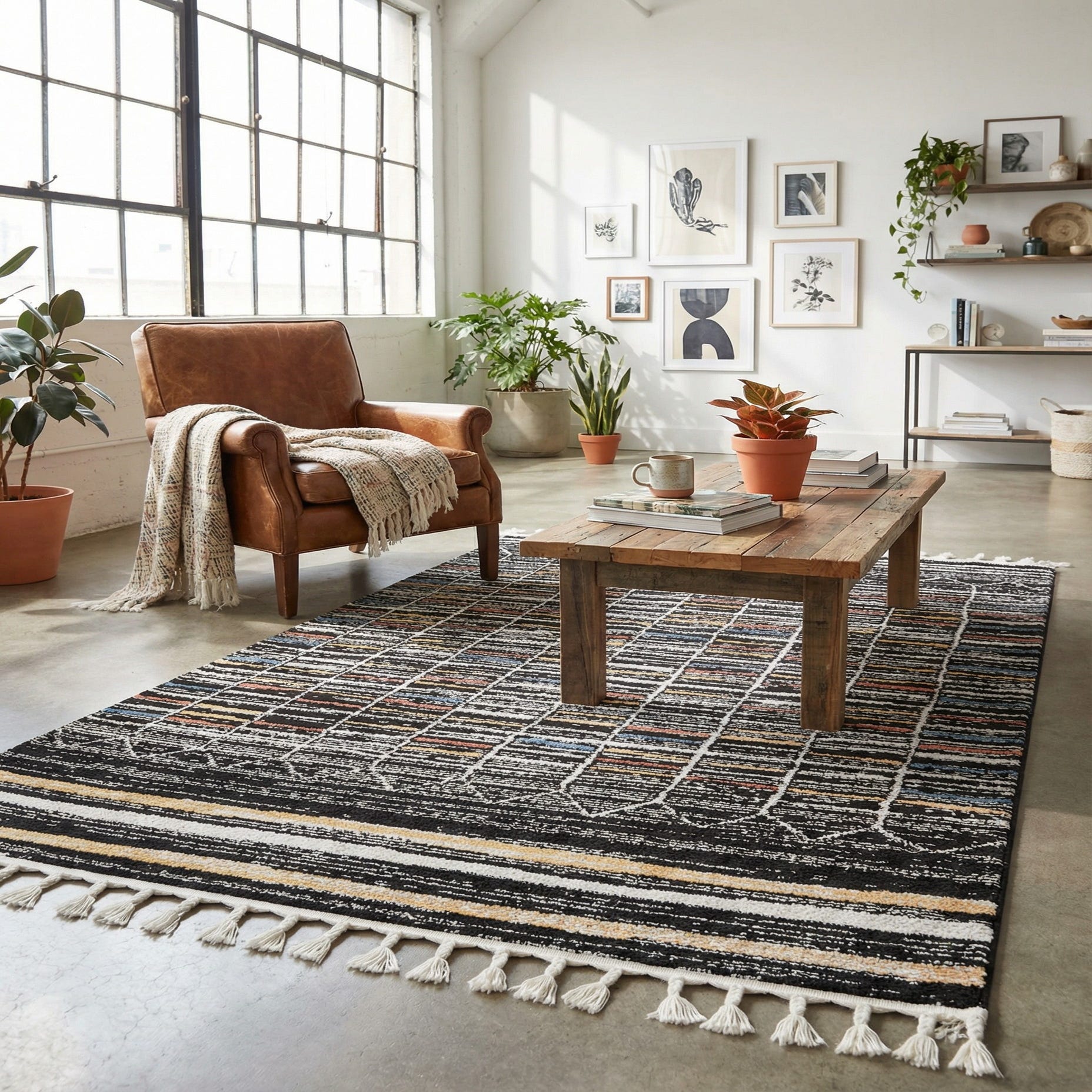 This rug fits well in modern-bohemian, mid-century, or industrial spaces where a bold linear pattern can anchor the room. Pair it with warm wood furniture and black metal accents for a cohesive look, use it to define a cozy reading nook or entryway, or layer it beneath a coffee table to introduce color without overwhelming other textiles. Its graphic rhythm and durable construction make it a versatile choice for living rooms, home offices, and transitional spaces.