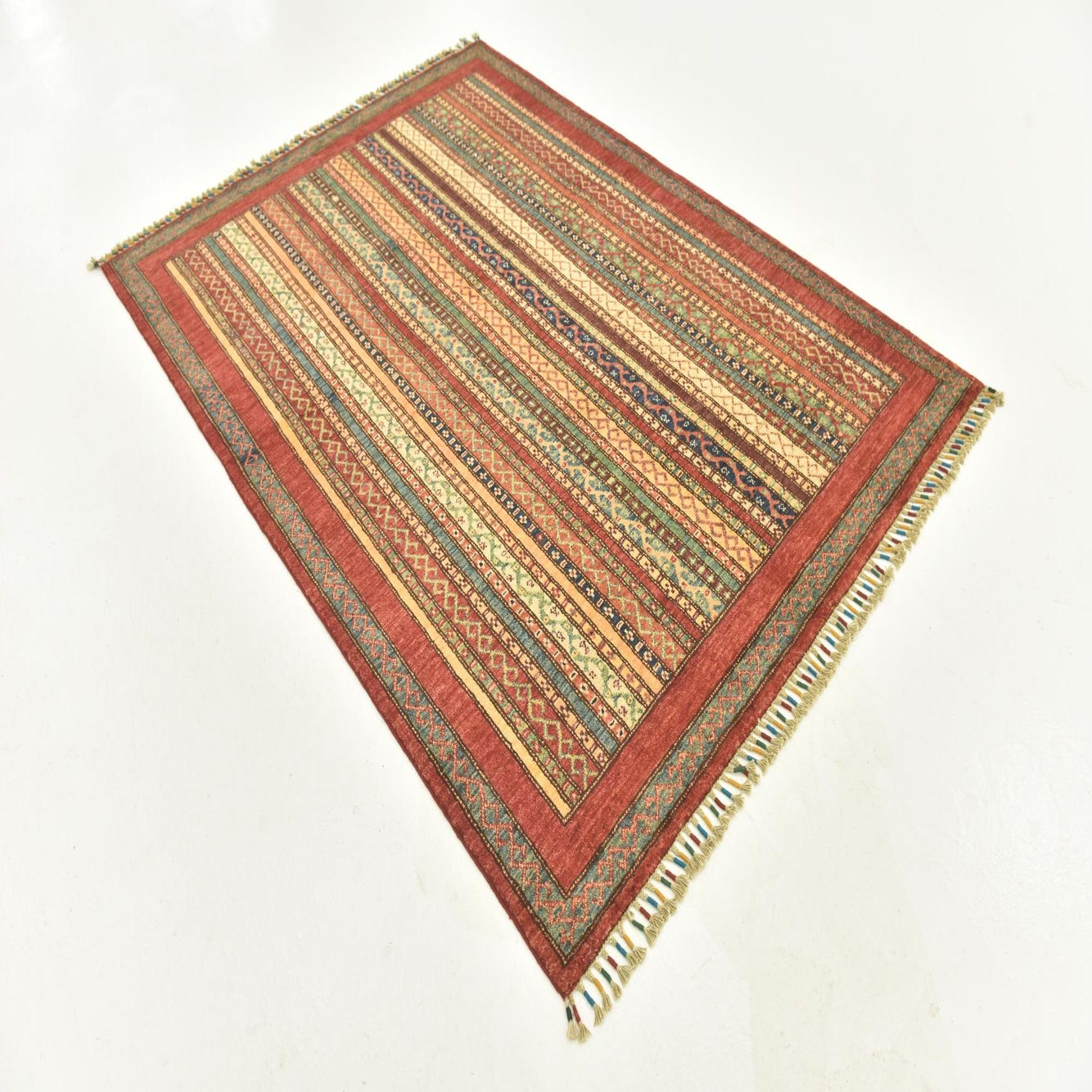 A 4x6 rectangular Ariana Ziegler rug featuring a multi-colored striped tribal pattern with a red border and fringe.