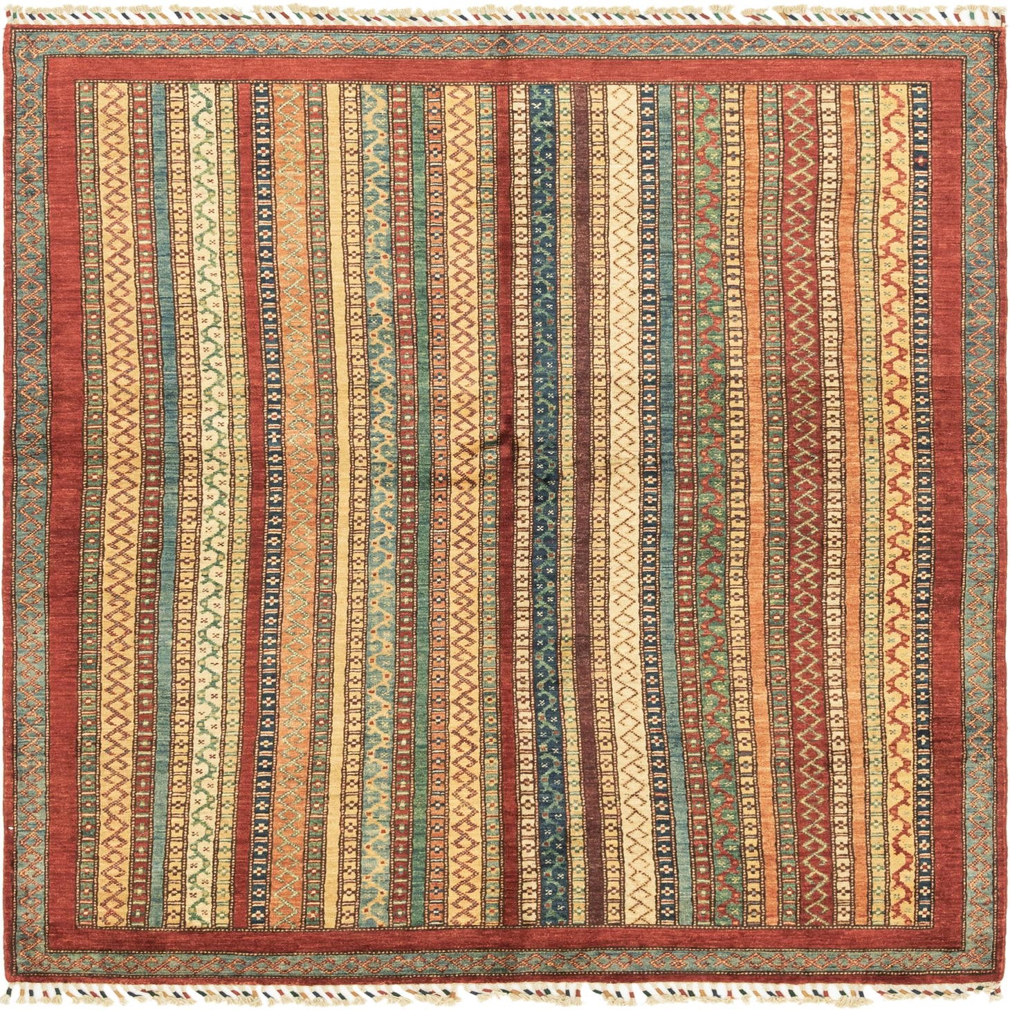 Primary color is Multi. Colors in this rug include: Multi, Beige, Blue, Brown, Navy Blue, Red, Orange, Gold, Green, Ivory.
