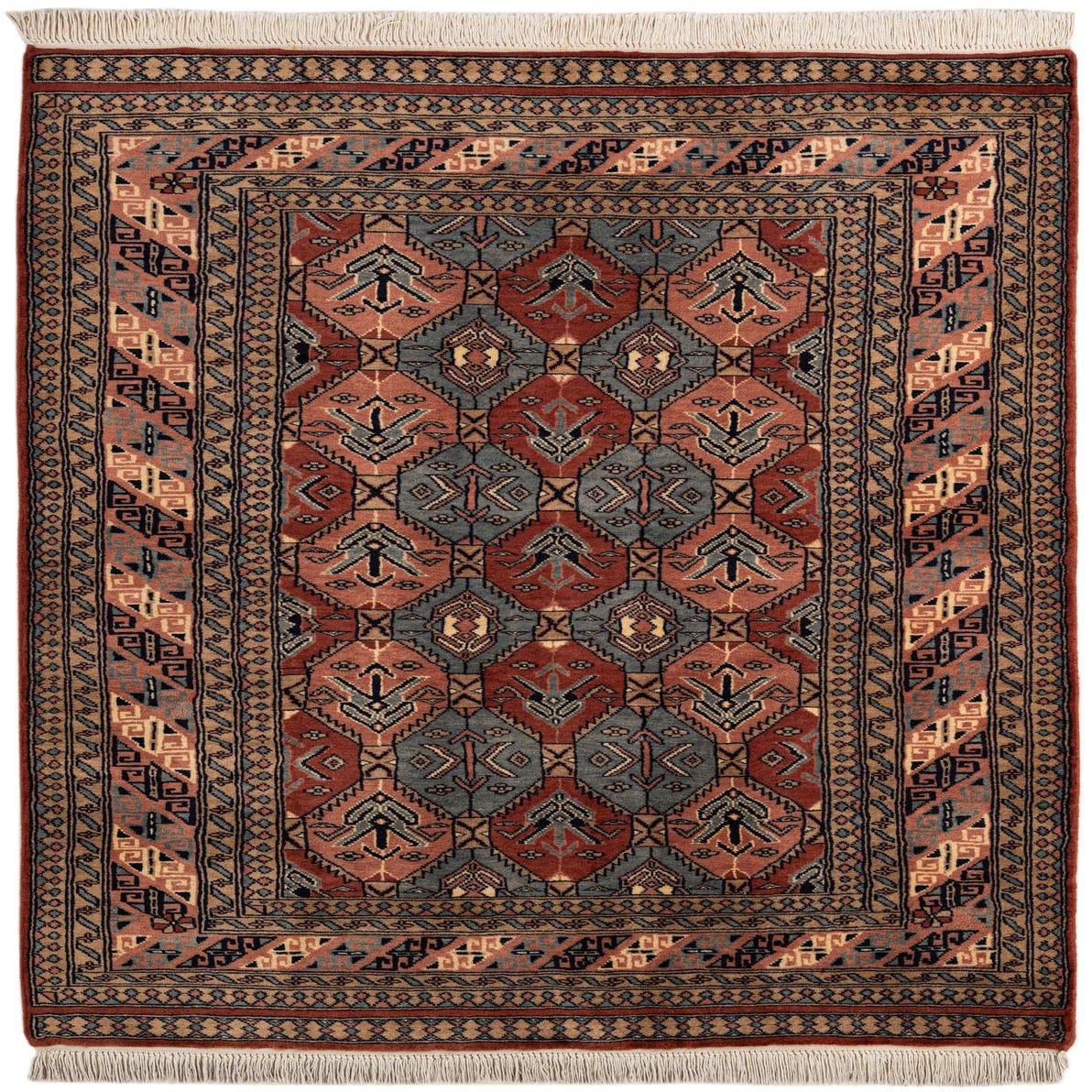 Hand-knotted in 100% wool, this Bokhara-inspired rug presents a repeating gul medallion pattern across a multi-hued field. Alternating rust and slate-gray octagonal motifs are punctuated by ivory and black accents, set within several narrow geometric borders in beige, brown and black. The dense hand-knotting produces a low-to-medium pile that feels soft and slightly plush underfoot, with a subtle texture that highlights the woven detail; the finished fringe at each end reinforces the traditional character.