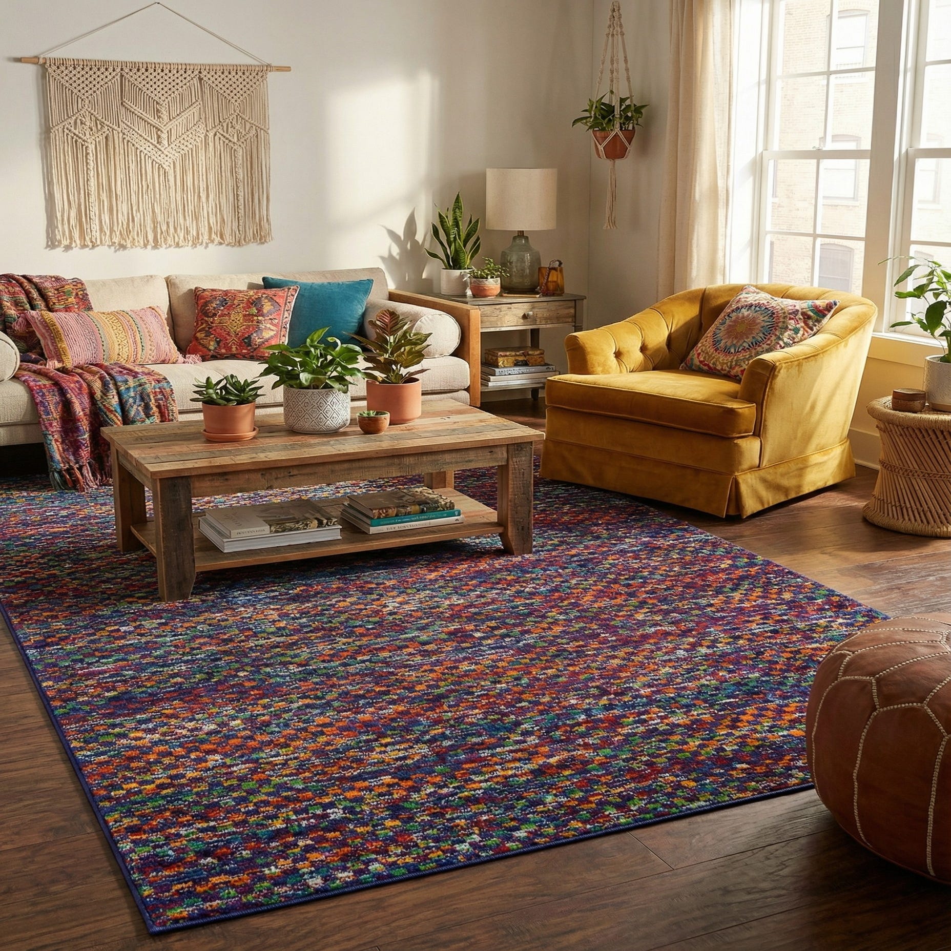 This piece works well where color and pattern can take center stage — think a contemporary living room under a coffee table, a vibrant entryway, or a kids’ play area where fun tones enhance the space. It pairs nicely with neutral sofas and light wood floors to balance the palette, or with mid-century and industrial furnishings to add contrast and warmth. The blue and green notes also coordinate with coastal or modern-boho schemes, while the orange and red highlights provide easy accents for throw pillows and artwork.