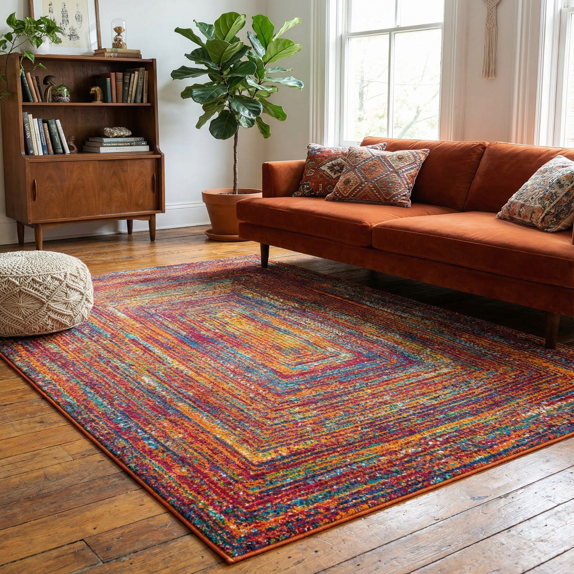 This rug works well where you want a bold, modern accent without competing patterns—try it to anchor a small seating area, brighten an entry or hallway, or add energy beneath a dining table. It pairs easily with neutral upholstery and warm wood tones, and also complements mid-century or eclectic rooms that use navy and turquoise accents. Layer it over a natural-fiber mat for added texture or place it in a lively family or play space to bring instant color and cohesion.