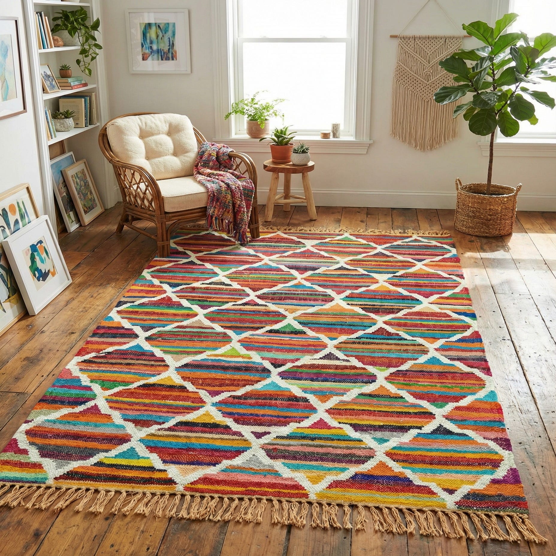 A vibrant trellis pattern built from rows of striped, rag-style diamonds sits on a multi-colored ground, with ivory lattice lines that give the design clear geometric rhythm. The palette mixes warm and cool tones — red, orange, yellow, green, blue and violet — balanced by touches of beige, brown, black and gold for depth. Hand-woven from 100% cotton, the flatwoven surface has a tactile, slightly nubby feel and visible woven texture; finished fringe at the ends adds casual character.