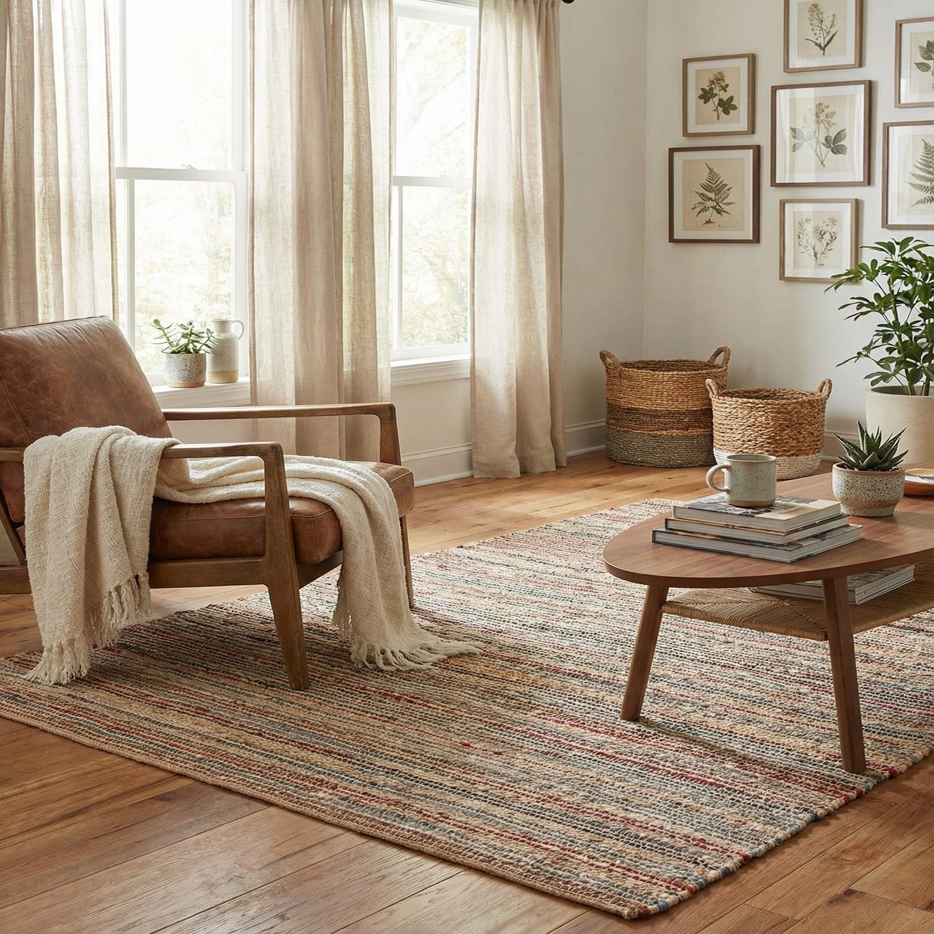 This piece fits well in relaxed, layered interiors — pair it with warm wood furniture and leather seating for a modern-rustic look, or add navy and terracotta accents for a coastal or boho palette. It works nicely in an entryway or kitchen runner setup, as a grounding layer beneath a coffee table, or placed at the foot of a bed; the neutral multi background and pops of color make it easy to coordinate with linen upholstery, woven baskets, pottery and indoor greenery.