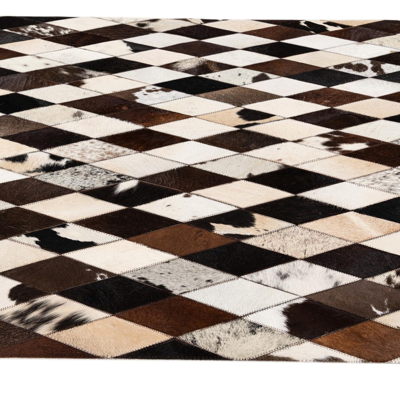 A 4x6 rectangular cowhide rug featuring a modern diamond pattern in various shades of brown, black, and white.