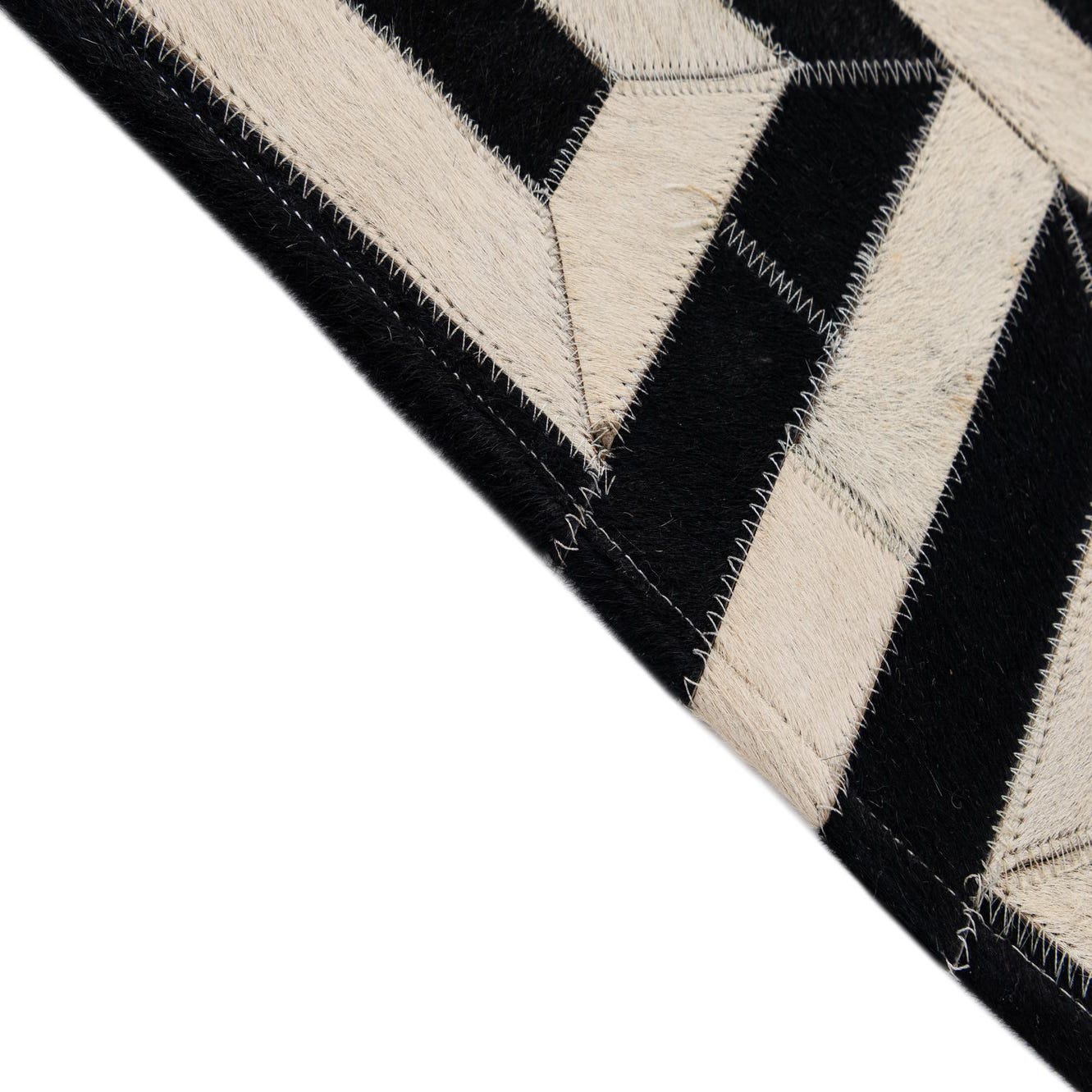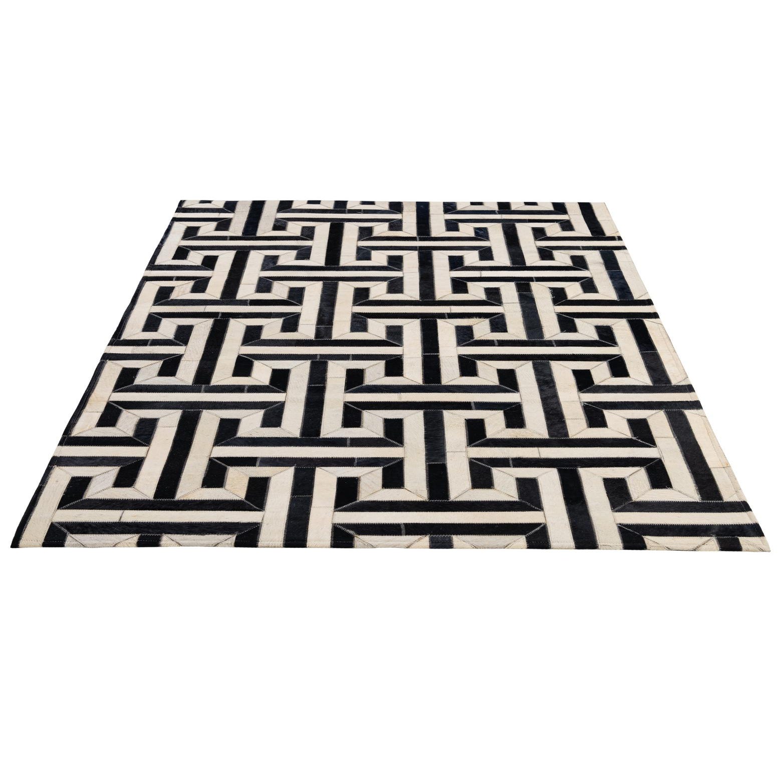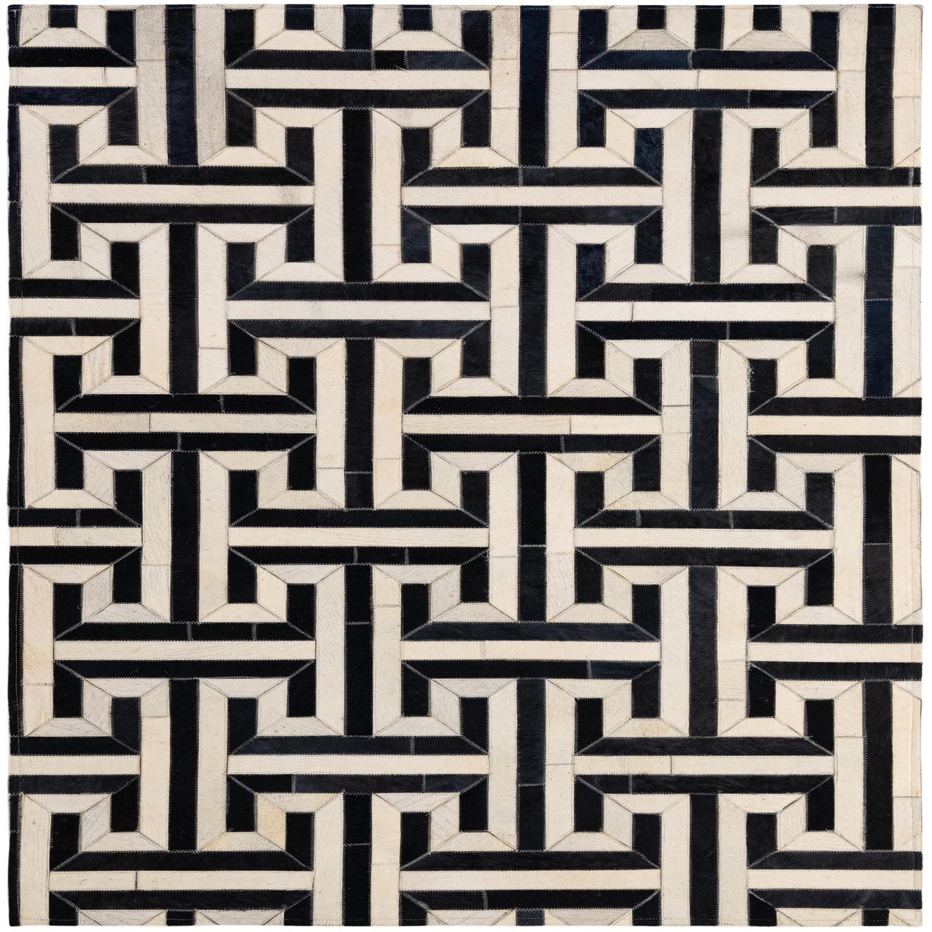 A rectangular 4x6 modern cowhide patchwork rug in a bold black and white geometric pattern, suitable for various indoor rooms.