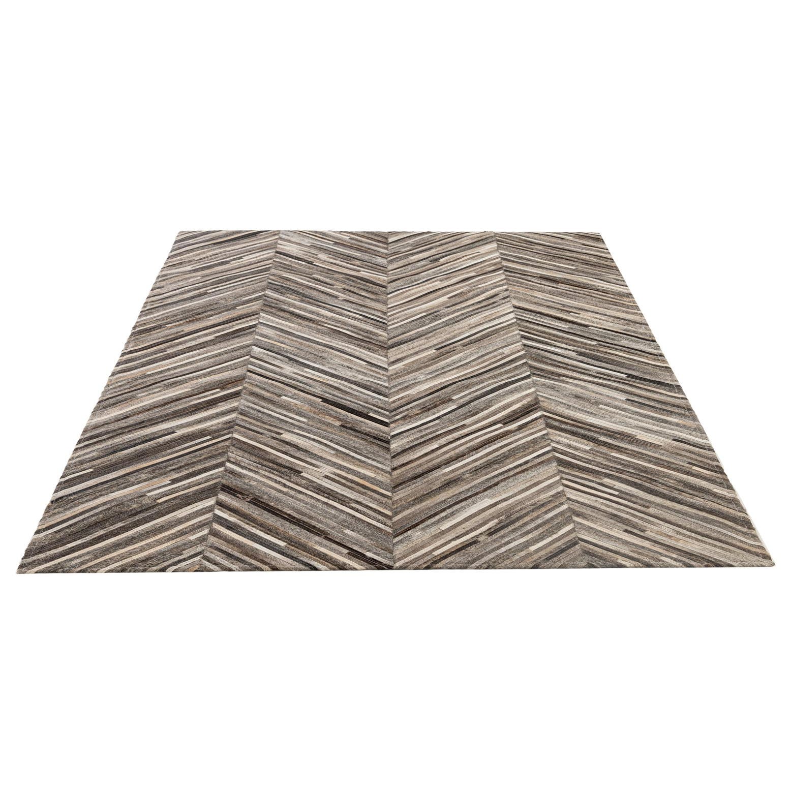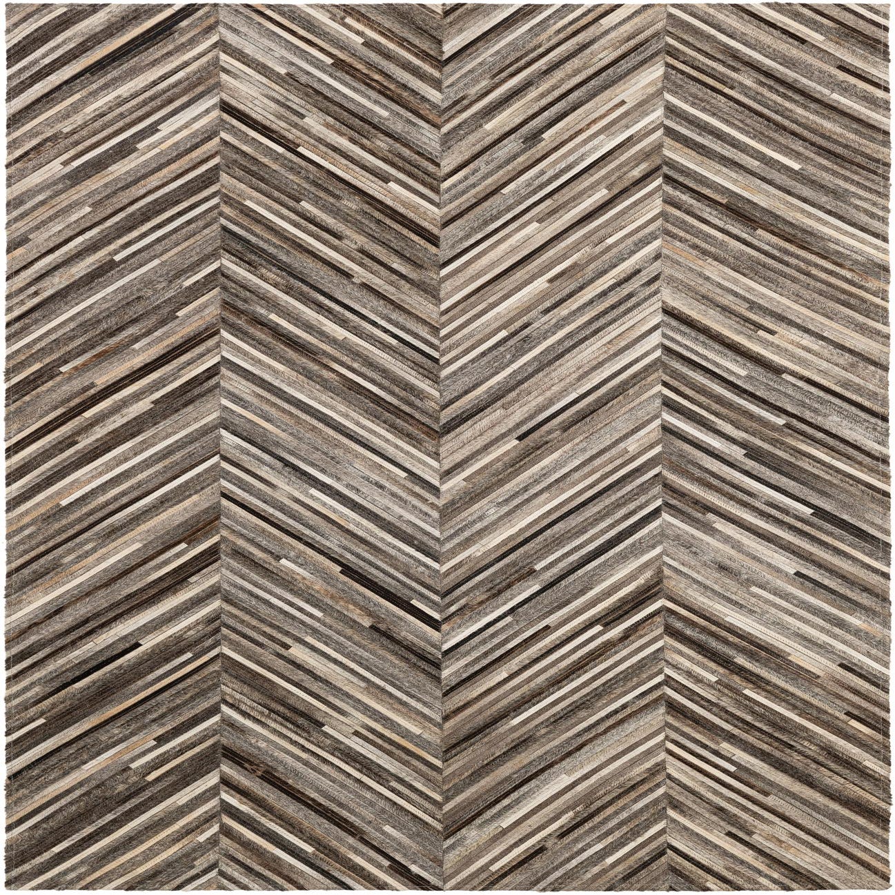 A bold chevron patchwork built from narrow hide strips forms a rhythmic, directional pattern across a multi background. Bands of beige, ivory, light brown, brown and black are laid in precise, angled seams to create a layered, geometric look. Hand made of cowhide and leather, the surface pairs hair-on-hide areas with smoother leather strips, producing subtle variation underfoot and a low-profile texture that highlights the natural grain and stitch lines of each panel.