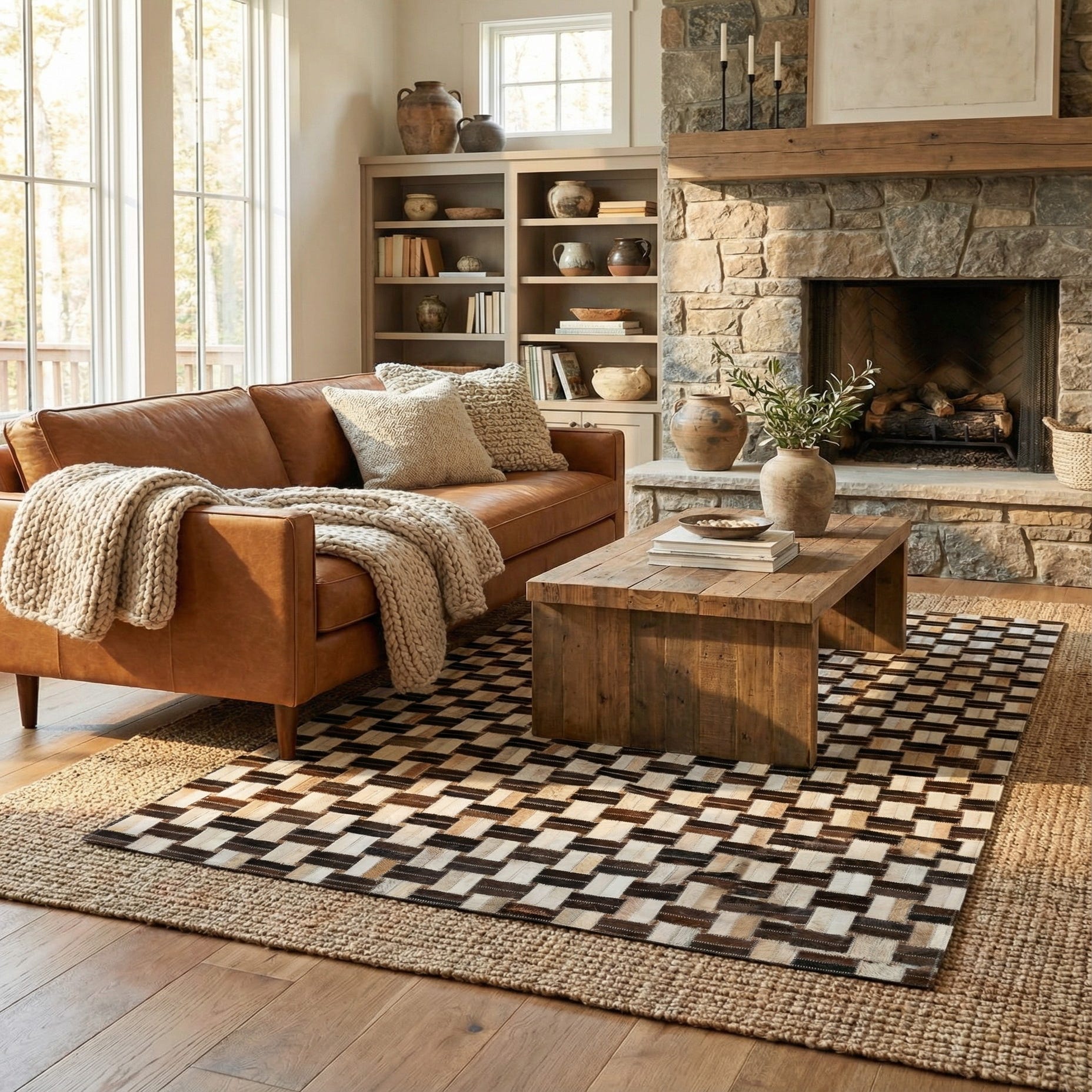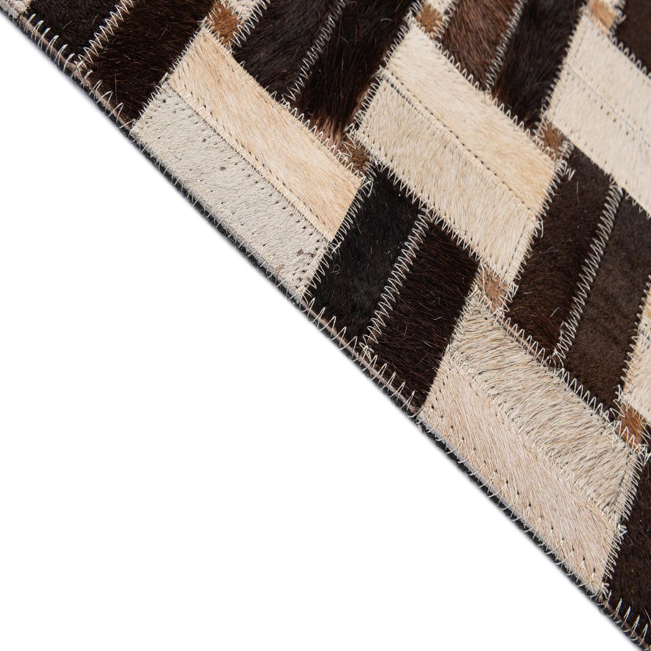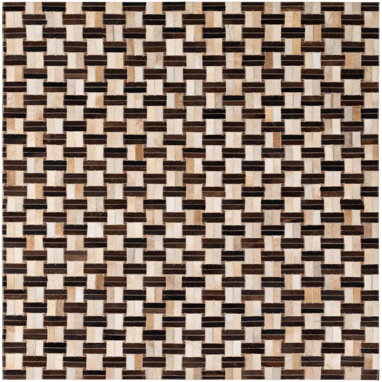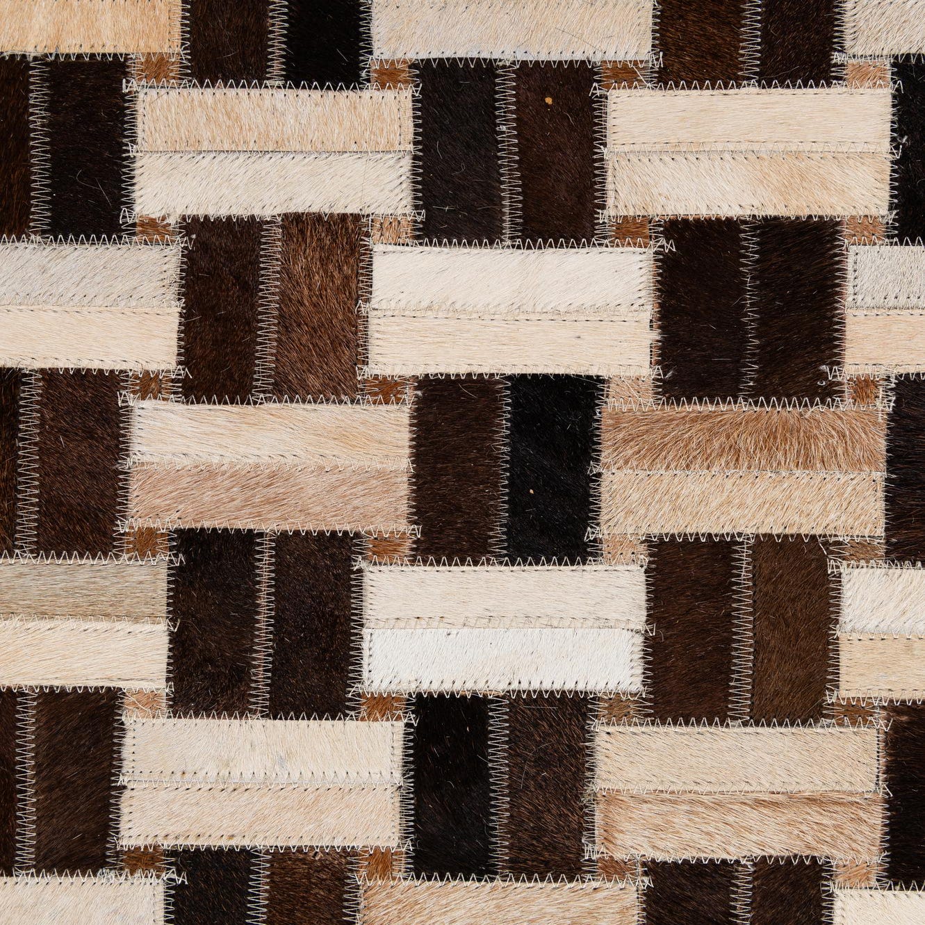 A grid of hand-stitched rectangular patches creates a basketweave effect across a multi-tonal background. Each tile of cowhide and leather alternates direction to produce subtle movement, while visible stitching adds a tailored, artisanal detail. The palette blends beige, ivory, tan, light brown, brown and black for a warm, neutral look with enough contrast to read clearly at a distance and quiet variation up close. The hair-on-hide surface is low-profile and slightly tactile, with the leather seams giving a soft sheen and a defined edge to each patch.