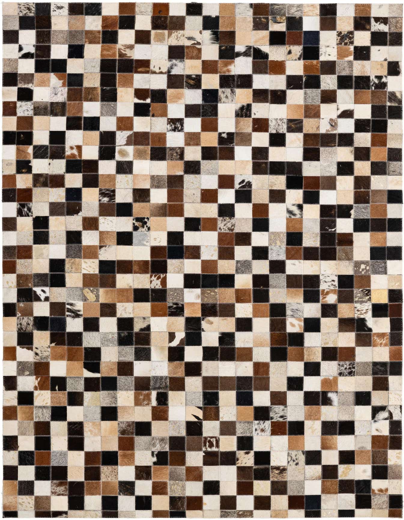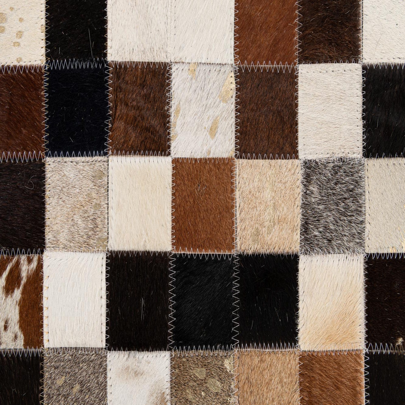 A 4x6 rectangular patchwork cowhide rug with a modern checkerboard pattern in various shades of brown, black, and white.