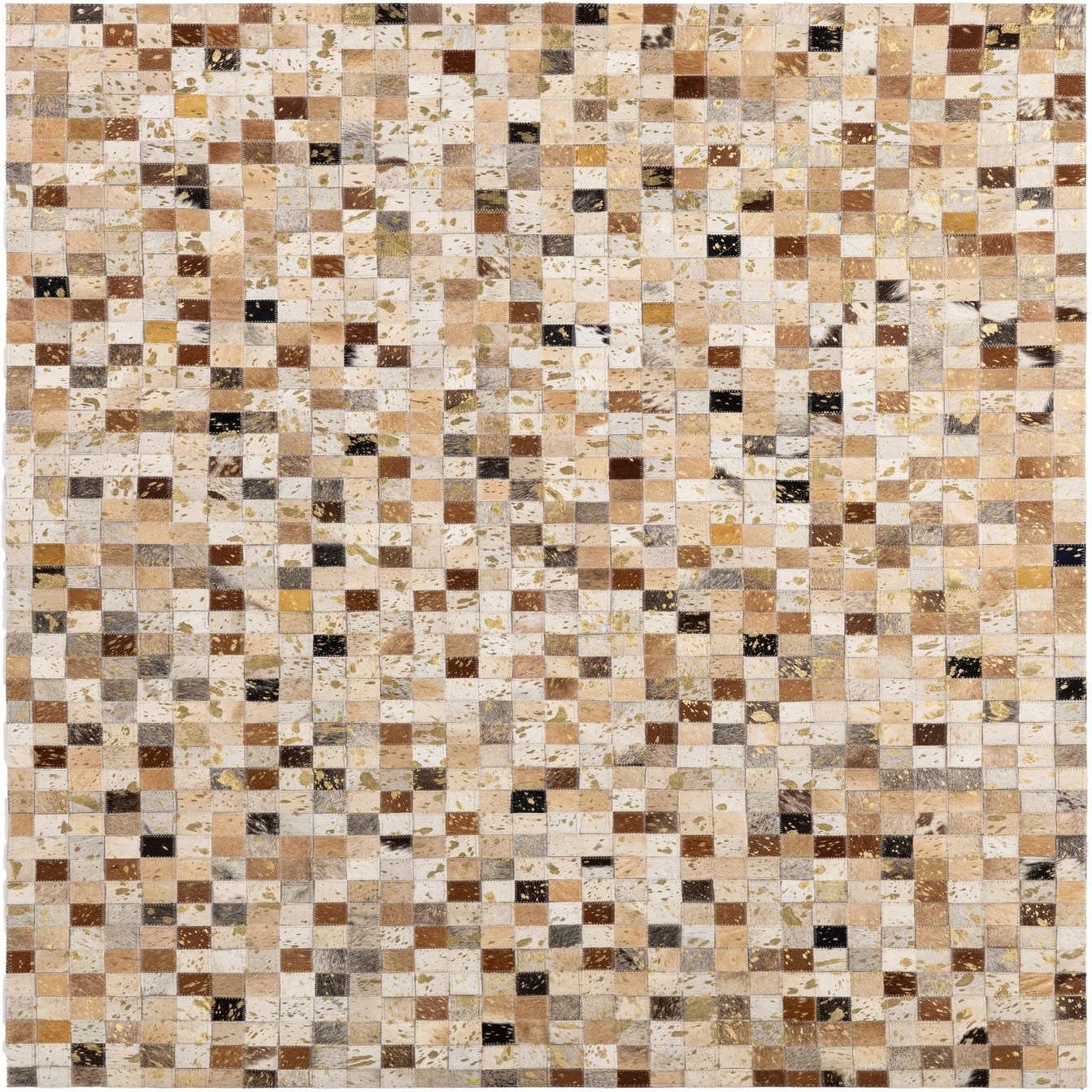 A 4x6 rectangular patchwork cowhide rug featuring a modern pattern of multi-colored squares with gold accents.