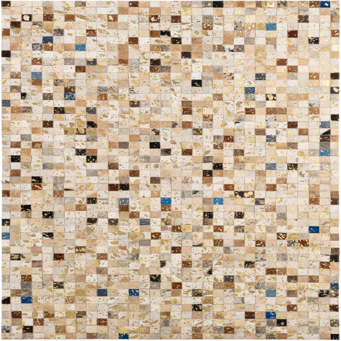 A 4x6 rectangular patchwork cowhide rug featuring multi-colored squares with gold metallic accents, perfect for a modern living room.