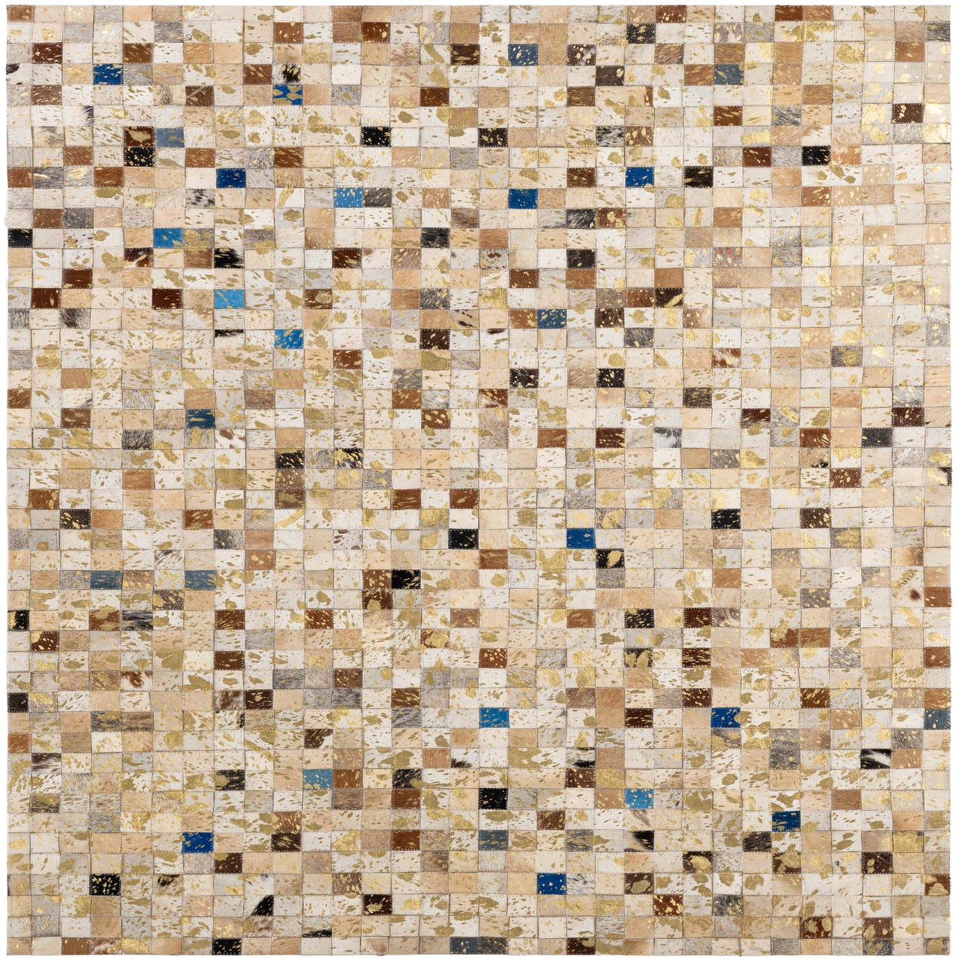 A 4x6 rectangular patchwork cowhide rug featuring a modern pattern of multi-colored squares with metallic gold accents.