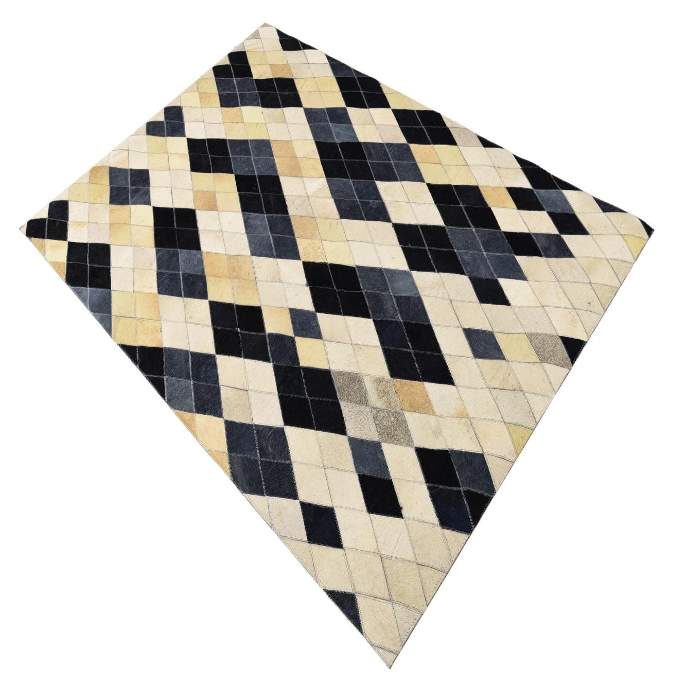 The rug's pattern is bold, with diamond shapes stitched together in a geometric sequence that provides both visual interest and textural appeal. The inherent variations in the natural materials lend each piece a unique character, ensuring no two rugs are exactly alike. The interplay of colors adds depth and dimension, making it an eye-catching centerpiece.
