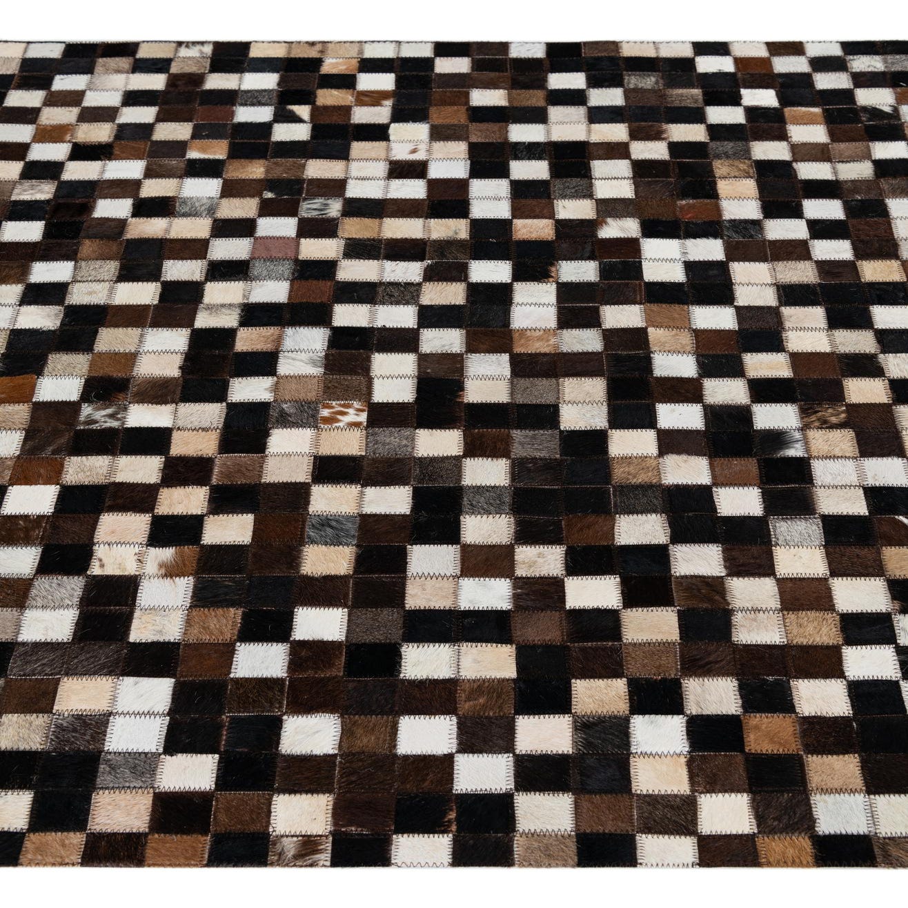 A 4x6 rectangular cowhide and leather rug featuring a modern checkered pattern in multi-colored brown, black, and white squares.