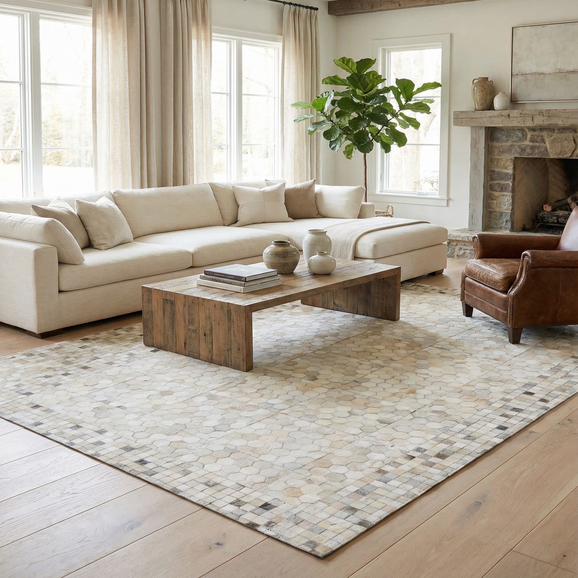 Handmade from cowhide and leather, this rug pairs a subtle geometric motif with a restrained neutral palette. Small hexagonal tiles are arranged into larger square panels across the field, while a narrow mosaic-style border of tiny squares frames the composition. The background is multi-tonal, blending ivory, beige, tan, brown and soft gray for a layered, natural look that brings quiet pattern and depth to a room.