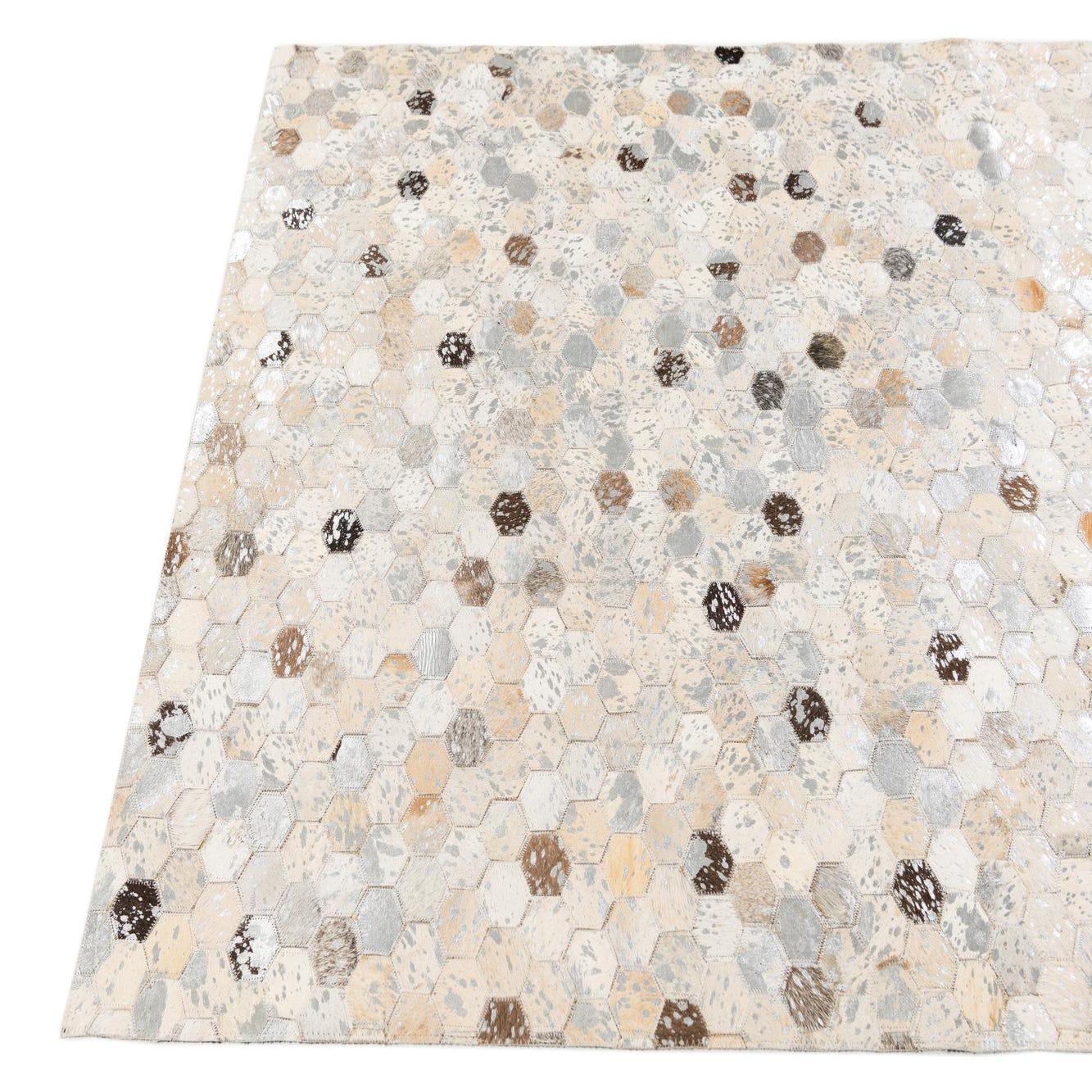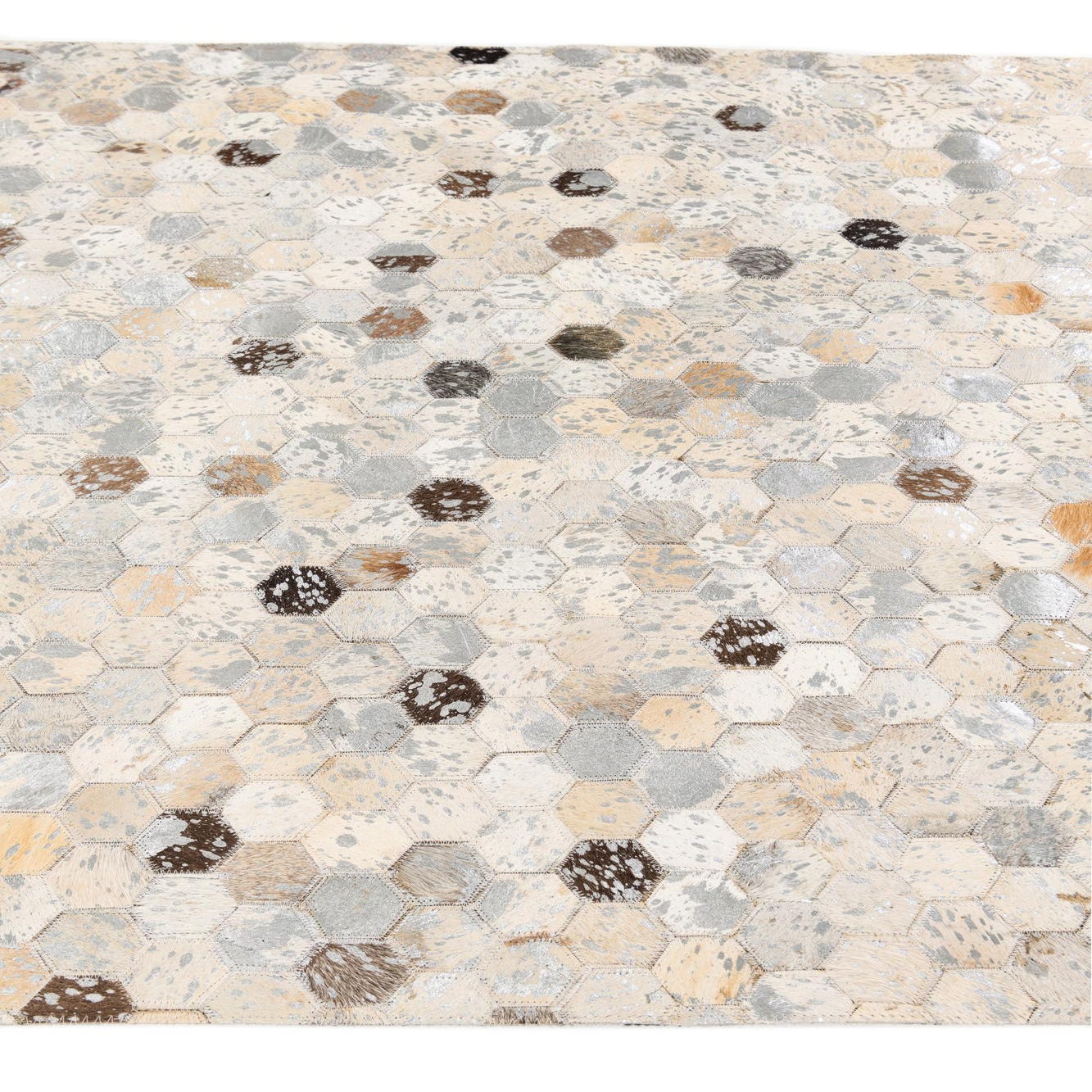 A 4x6 rectangular multi-colored cowhide rug featuring a modern hexagonal patchwork design in various natural tones.