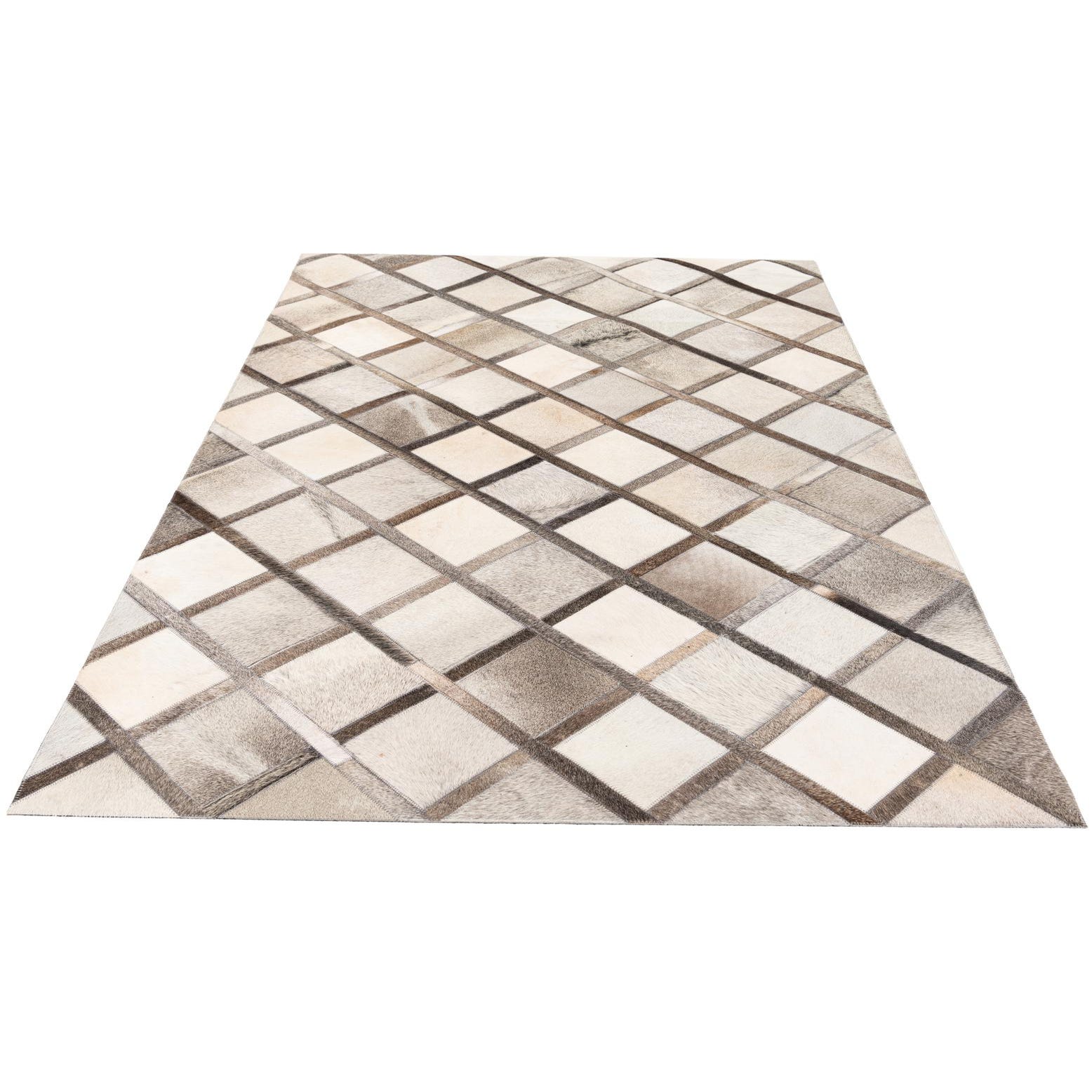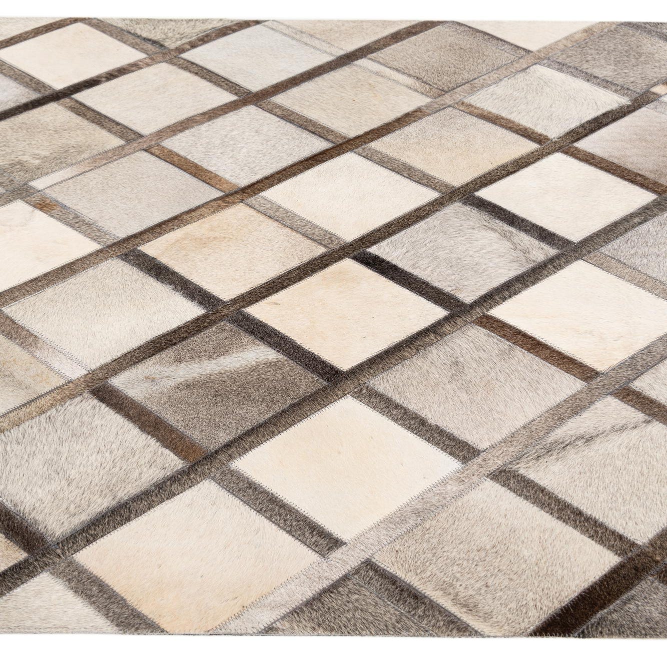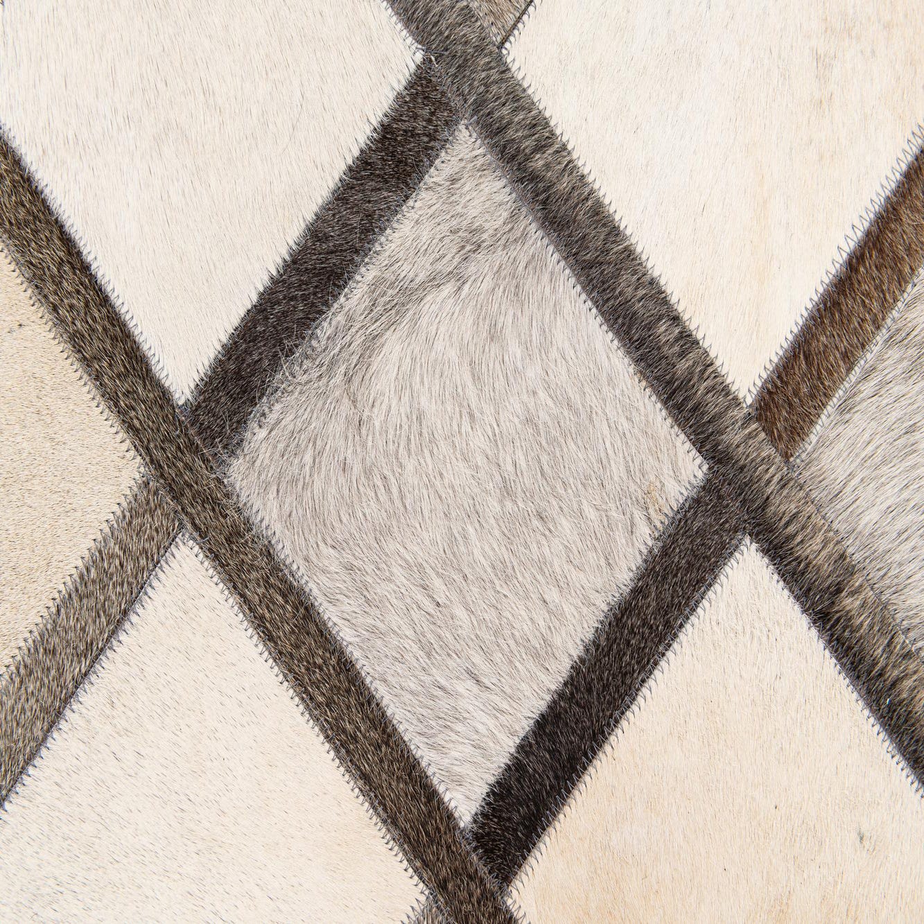 A rectangular 4x6 modern cowhide rug with a multi-colored diamond pattern in shades of brown, beige, and cream.